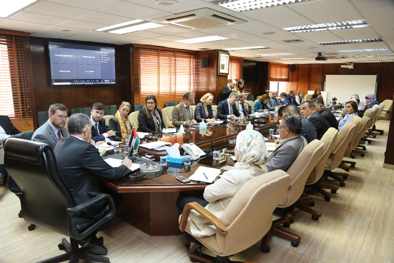 اجتمع وزير المياه والري المهندس محمد النجار خلال اجتماع في مكتبه بوزارة المياه والري اليوم الثلاثاء مع ممثلي الجهات المانحة والتمويلية لقطاع المياه والمهتمة بتقديم الدعم المالي لمشروع الناقل الوطني ، الوكالة الامريكية للتنمية الدولية USAID والاتحاد الأوروبي EU ، بنك الاعمار الألماني KFW ،بنك الاستثمار الأوروبي EIB وأعضاء من السفارة الألمانية، المعهد الفيدرالي الألماني BGR ، الوكالة الفرنسية للتنمية ِAFD وجهات أخرى بحضور امين عام وزارة المياه والري د. جهاد المحاميد وأمين عام سلطة وادي الأردن م. منار محاسنة وامين عام سلطة المياه بالوكالة م. رامي أبو رواق وكبار المساعدين في قطاع المياه مستعرضا الجهود والإجراءات التي يقوم بها قطاع المياه بالتعاون مع كافة المعنيين والجهود المضنية التي تبذل لمواجهة مختلف التحديات والسير قدما بتحديث وتطوير الاستراتيجية الوطنية لقطاع المياه واستراتيجية خفض الفاقد المائي ومشروع الناقل الوطني والتنسيق بين مختلف الجهات التمويلية والمانحة .