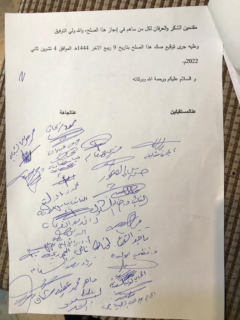 وقدمت الجاهة الشكر والتقدير باسم عشيرة ال مسعد إلى عشيرة الصباحين ولكل من حضر على حسن الاستقبال وعلى ما أبدوه تجاه الجاهة الكريمة الى توقيع بين عشيرتي المسعد والصباحين صك صلح عشائري في ديوان الصباحين بمحافظة اربد.