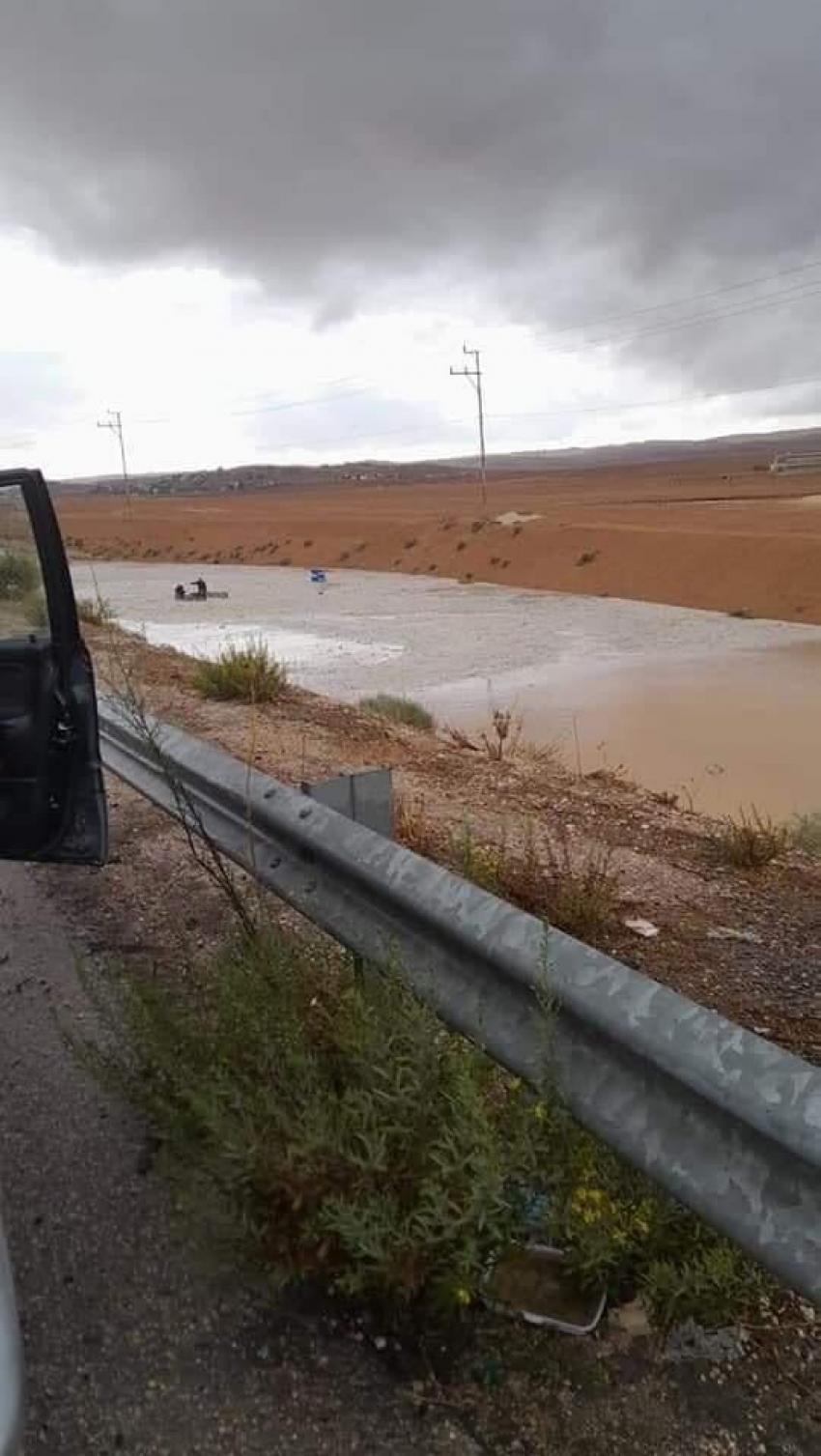 بالصور...انقاذ شخصين علقا داخل مركبتهما بسبب ارتفاع منسوب المياه في المفرق