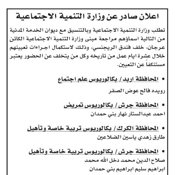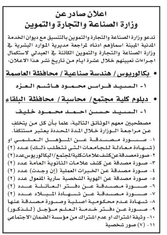 دعت عدد من الوزارات والمؤسسات الحكومية اليوم الإثنين، بالتنسيق مع ديوان الخدمة المدنية، عدداً من المرشحين للتعيين، مراجعة الوزارة لاستكمال إجراءات التعيين.
