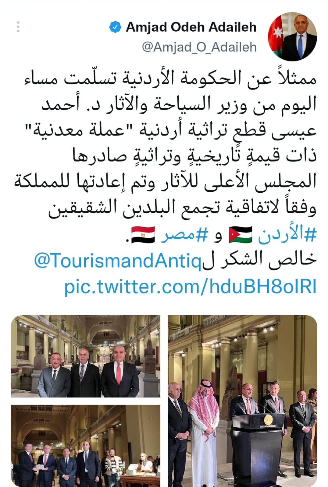 ممثلاً عن الحكومة الأردنية تسلّمت مساء اليوم من وزير السياحة والآثار د. أحمد عيسى قطعٍ تراثية أردنية "عملة معدنية" ذات قيمةٍ تاريخيةٍ وتراثيةٍ صادرها المجلس الأعلى للآثار وتم إعادتها للمملكة وفقاً لاتفاقية تجمع البلدين الشقيقين الأردن ومصر