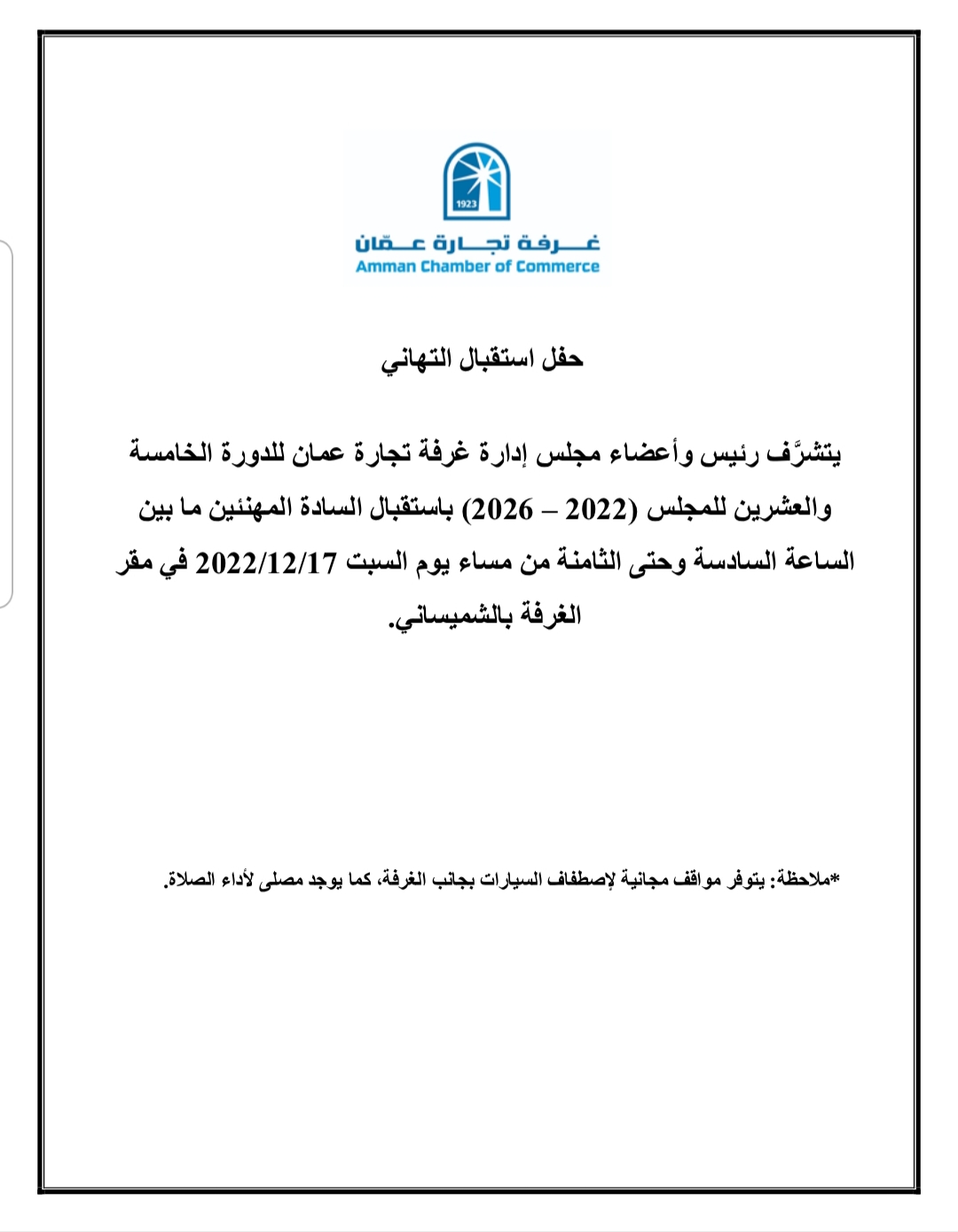 أعلنت غرفة تجارة عمان اليوم عن استقبال المهنئين بفوز مجلس إدارة غرفة تجارة عمان المنتخب للدورة الخامسة والعشرين للمجلس، ونيلهم ثقة زملائهم من اعضاء الهيئة العامة وذلك يوم السبت 17/12/2022 ما بين الساعة السادسة مساء وحتى الساعة الثامنة مساء في مقر الغرفة/الشميساني.