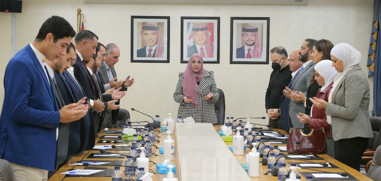 وقدمت رئيسة الكتلة فايزة عضيبات وأعضاءها في بداية الاجتماع التعازي لأهل الشهيد العقيد عبدالرزاق الدلابيح الذي استشهد اثناء تأديته الواجب في الاعتصامات الاخيرة في محافظة معان، وقرأوا الفاتحة على روح الشهيد.