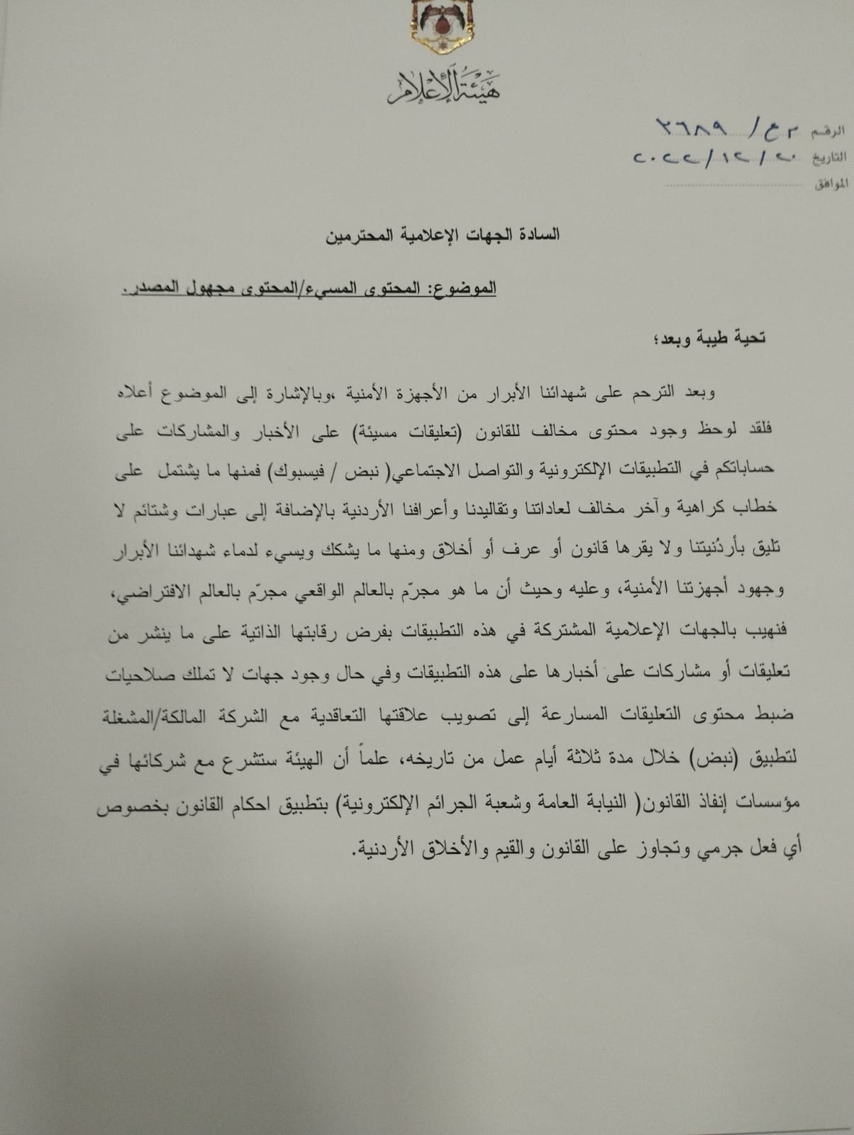 قال المدير العام لهيئة الإعلام، بشير حسن المومني، إنه لوحظ وجود محتوى مخالف للقانون (تعليقات مسيئة) على الأخبار والمشاركات على حسابات وسائل الإعلام في التطبيقات الإلكترونية والتواصل الاجتماعي (نبض / فيسبوك).