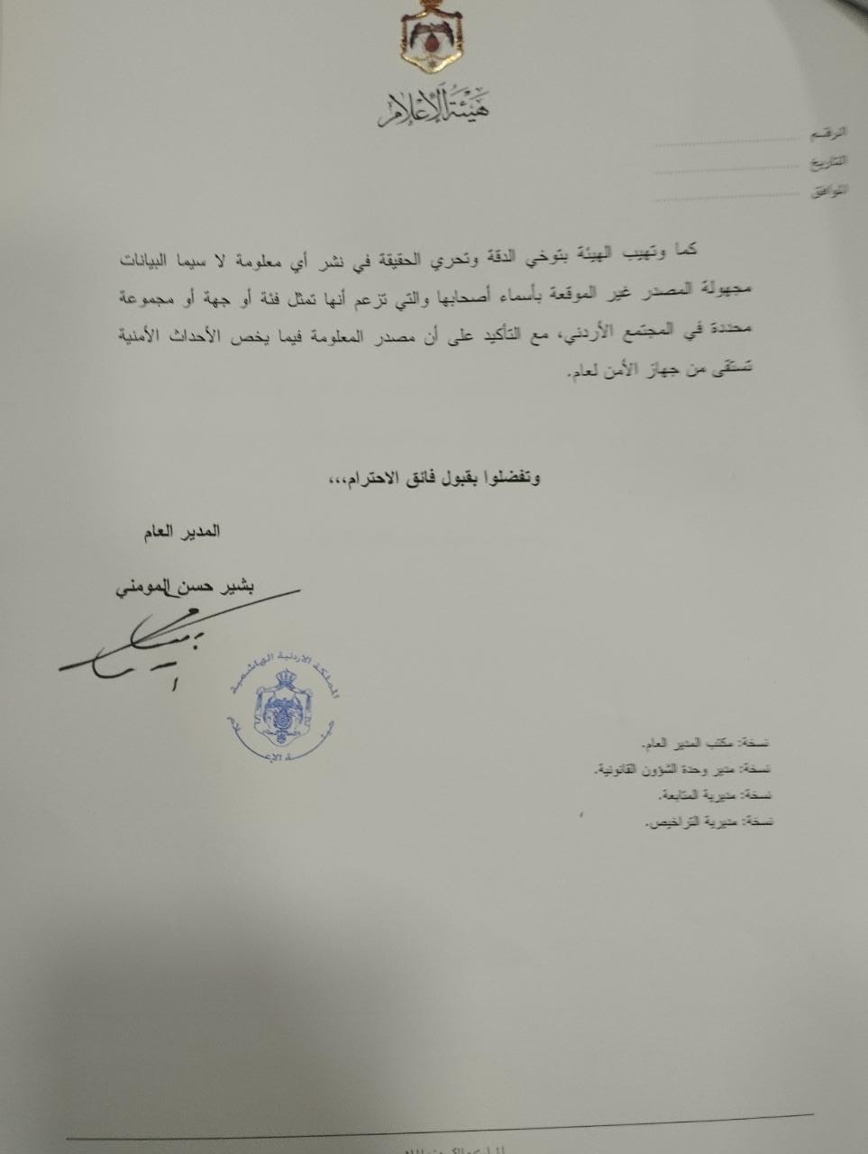 كما وتهيب الهيئة بتوخي الدقة وتحري الحقيقة في نشر أي معلومة لا سيما البيانات مجهولة المصدر غير الموقعة بأسماء أصحابها والتي تزعم أنها تمثل فئة أو جهة أو مجموعة محددة في المجتمع الأردني، مع التأكيد على أن مصدر المعلومة فيما يخص الأحداث الأمنية تستقی من جهاز الأمن العام.