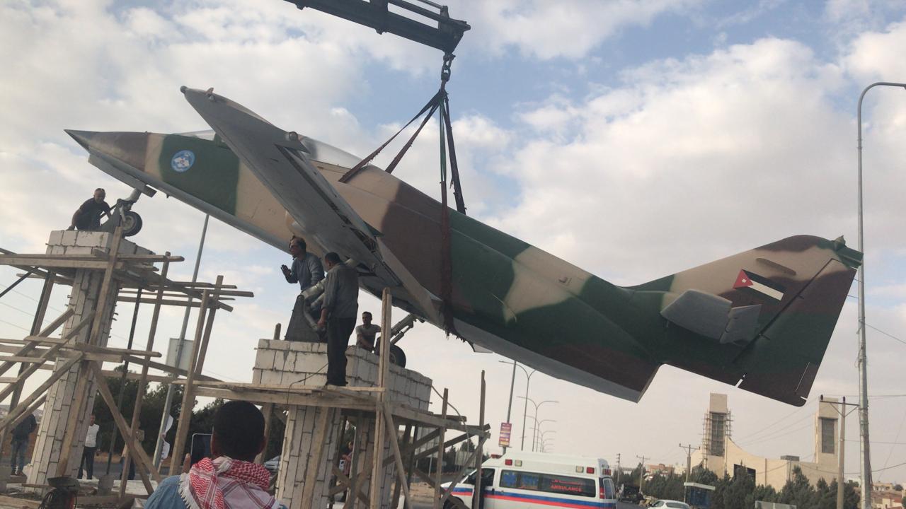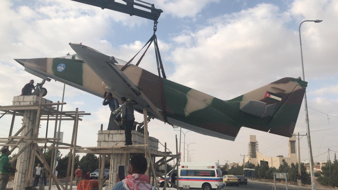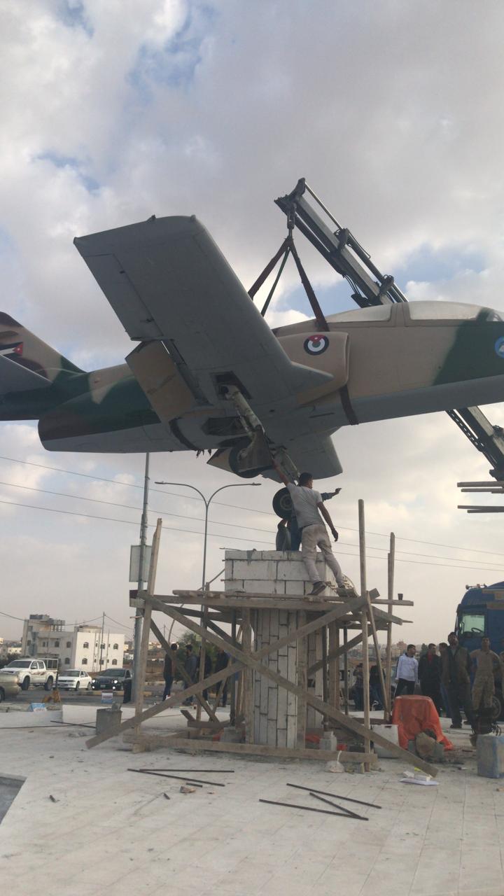 نسور سلاح الجو الأردني يقومون بتثبيت طائره لوكاسا الحربيه على دوار الشهيد الكساسبه في الكرك