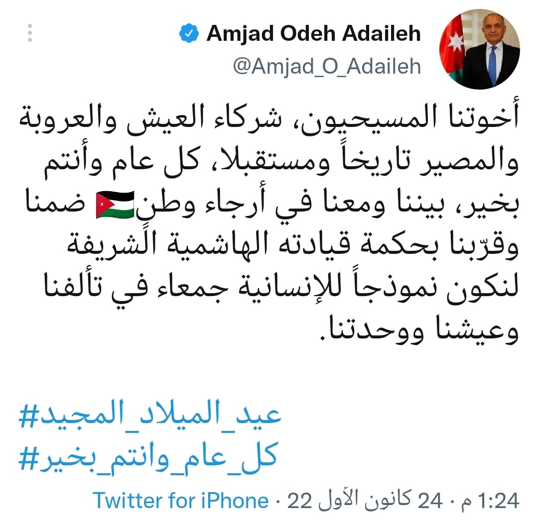 وقال العضايلة، في تغريدة له على حسابه الشخصي على موقع التواصل الاجتماعي تويتر، "أخوتنا المسيحيون، شركاء العيش والعروبة والمصير تاريخاً ومستقبلا، كل عام وأنتم بخير".