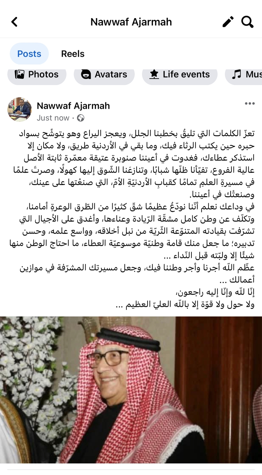 في وداعك نعلم أنّنا نودّعُ عظيمًا شقّ كثيرًا من الطّرق الوعرةِ أمامنا، وتكلّف عن وطن كامل مشقّة الرّيادة وعناءها، وأغدق على الأجيال التي تشرّفت بقيادته المتنوّعة الثّريّة من نبل أخلاقه، وواسع علمه، وحسن تدبيره؛ ما جعل منك قامة وطنيّة موسوعيّة العطاء، ما احتاج الوطن منها شيئًا إلا ولبّته قبل النّداء …