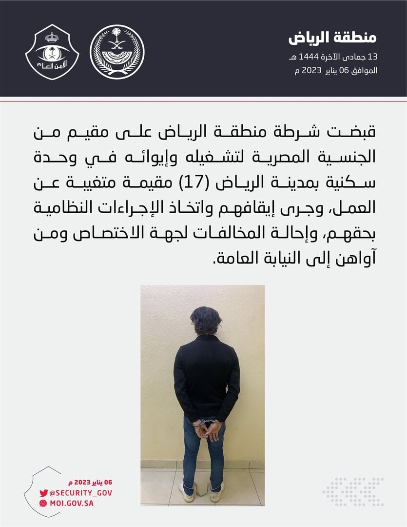 ألقى الأمن العام السعودي، القبض على مقيم مصري لتشغيله وإيوائه في وحدة سكنية بمدينة الرياض 17 مقيمة متغيّبة عن العمل.