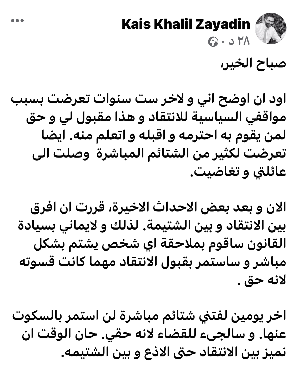 الزيادين : تعرضت للإنتقاد بسبب مواقفي السياسية فهذا مقبول ، لكن أن يصل الأمر للشتم المباشر فهذا مرفوض