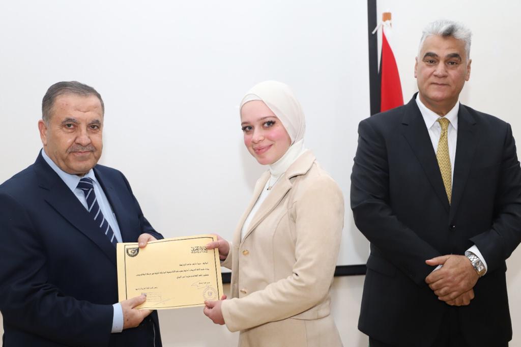 وفي نهاية الحفل قام نائب رئيس الجامعة للشؤون الاكاديمية بتكريم العالمين الجليلين في اللغة العربية استاذ علم النحو واللغويات الاستاذ الدكتور جعفر نايف عبابنة وأستاذ علم البلاغة والنقد الاستاذ الدكتور عبدالكريم احمد الحياري ومدرسة اللغة العربية والأدب السيدة هيا عربيات كما وتم تكريم عدد من اعضاء الهيئة التدريسية والإدارية في الكلية وتسليم خريجي قسم اللغة العربية المتوقع تخرجهم شهادات تقديرية مقدما المباركة والتهنئة لهم ولذويهم .