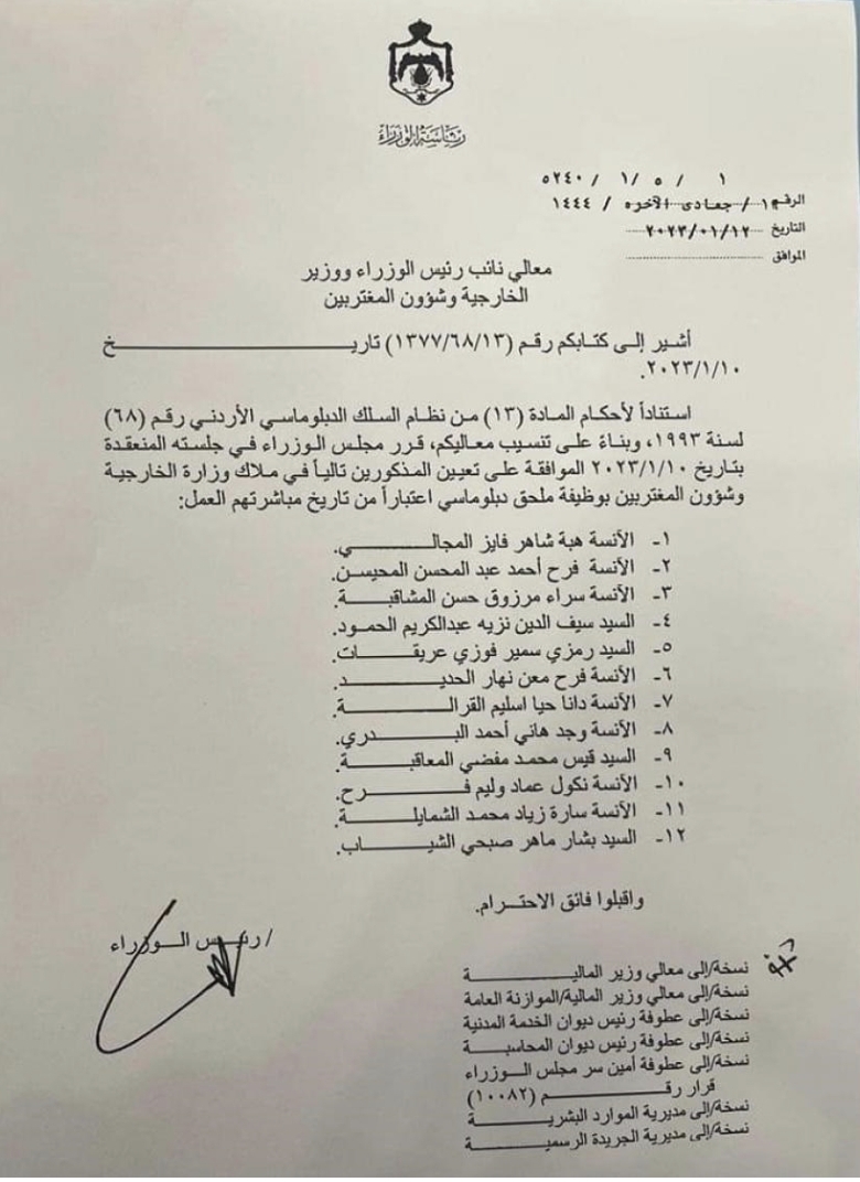 قرر مجلس الوزراء الموافقة على تعيين المذكورين تاليا في ملاك وزارة الخارجية وشؤون المغتربين بوظيفة ملحق دبلوماسي اعتبارا من تاريخ مباشرتهم العمل.