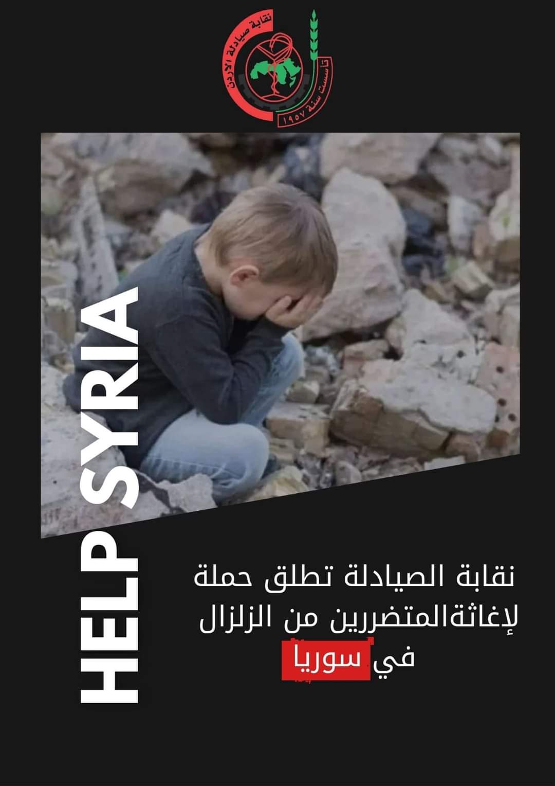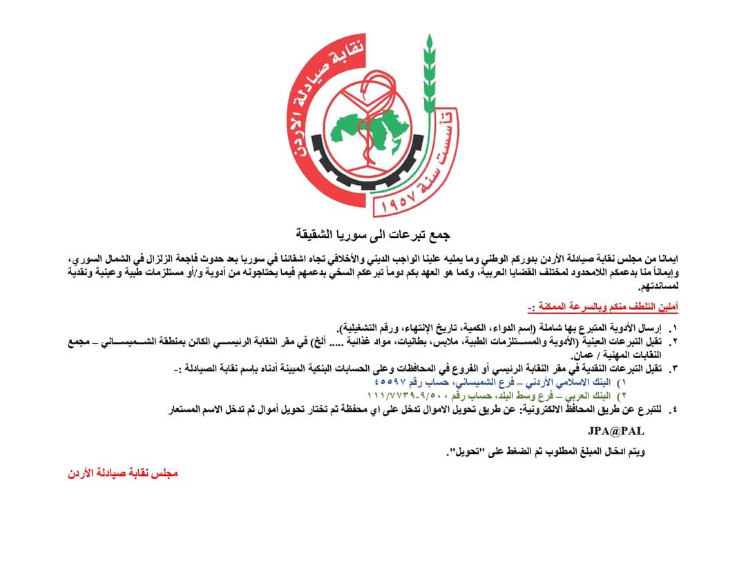 ايمانا من مجلس نقابة صيادلة الأردن بدوركم الوطني وما يمليه علينا الواجب الديني والأخلاقي تجاه اشقائنا في سوريا بعد حدوث فاجعة الزلزال في الشمال السوري، وإيماناً منا بدعمكم اللامحدود لمختلف القضايا العربية، وكما هو العهد بكم دوماً تبرعكم السخي بدعمهم فيما يحتاجونه من أدوية و/أو مستلزمات طبية وعينية