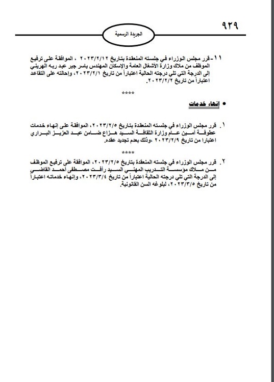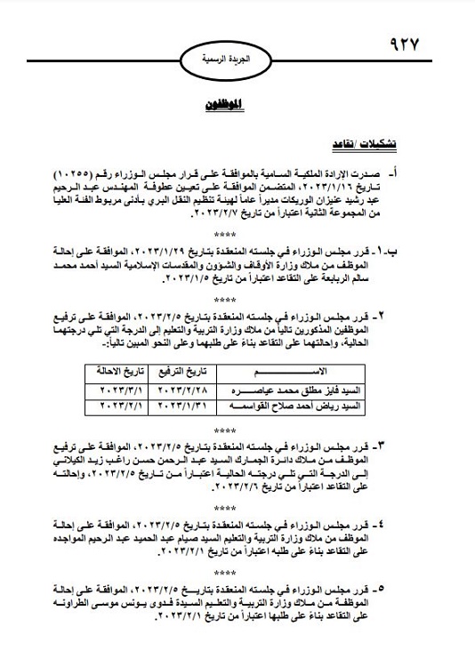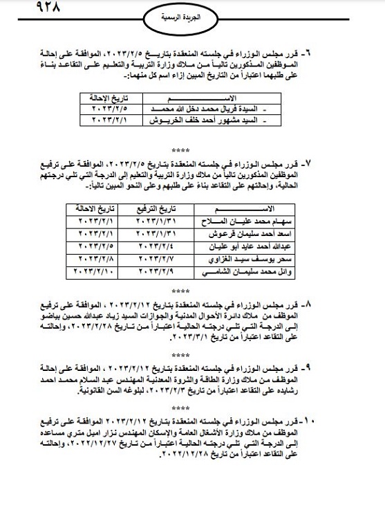 صدر في عدد الجريدة الرسمية، الخميس، قرارات مجلس الوزراء بإحالة موظفين حكوميين الى التقاعد.