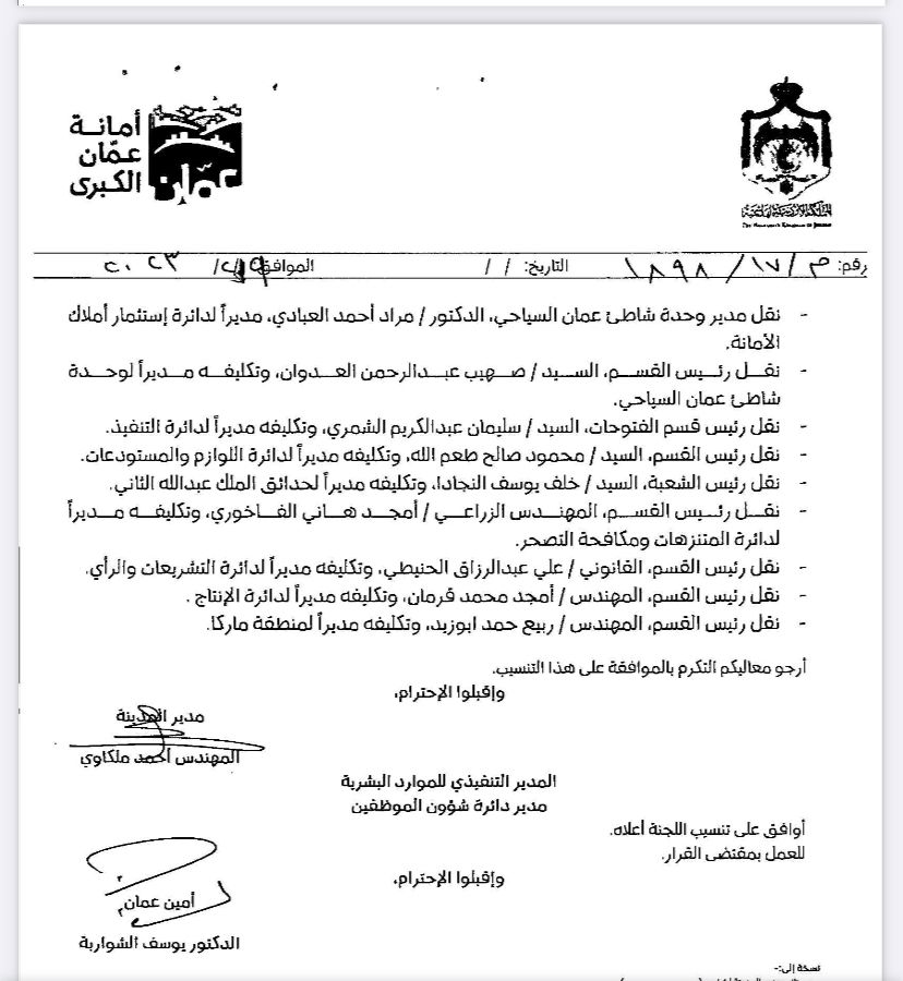 تنقلات إدارية في أمانة عمان الكبرى (أسماء)
