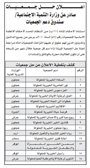 وطالبة الوزارة من الدائنين والمدينين في هذه الجمعيات جميعاً الذين لديهم حقوق أو عليهم التزامات للجمعيات أدناه مراجعة لجنة حل الجمعية المبينة أزاء إسم كل جمعية خلال شهر من تاريخه، على أن تكون المطالبات مُعززة بالوثائق والمستندات.