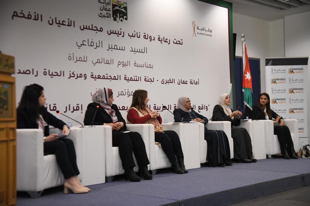 تحت رعاية دولة نائب رئيس مجلس الأعيان سمير الرفاعي نفذ مركز الحياة – راصد بالتعاون مع أمانة عمان الكبرى – اللجنة المجتمعية مؤتمراً وطنياً بمناسبة يوم المرأة العالمي تحت عنوان "واقع المشاركة الحزبية للمرأة، بعد عام على إقرار قانون الأحزاب 2022 من قبل البرلمان الأردني"، وبحضور أمين عام وزارة الشؤون السياسية والبرلمانية الدكتور علي الخوالدة، وحضور عدد من النخب السياسية والحزبية والنسائية والشبابية من مختلف القطاعات والمحافظات، ويأتي هذا المؤتمر انسجامًا مع رؤية الدولة الأردنية في التحديث الشامل، المتمثل في تحديث المنظومات السياسية والاقتصادية والإدارية، ومتوائمًا مع مخرجات اللجنة الملكية لتحديث المنظومة السياسية.