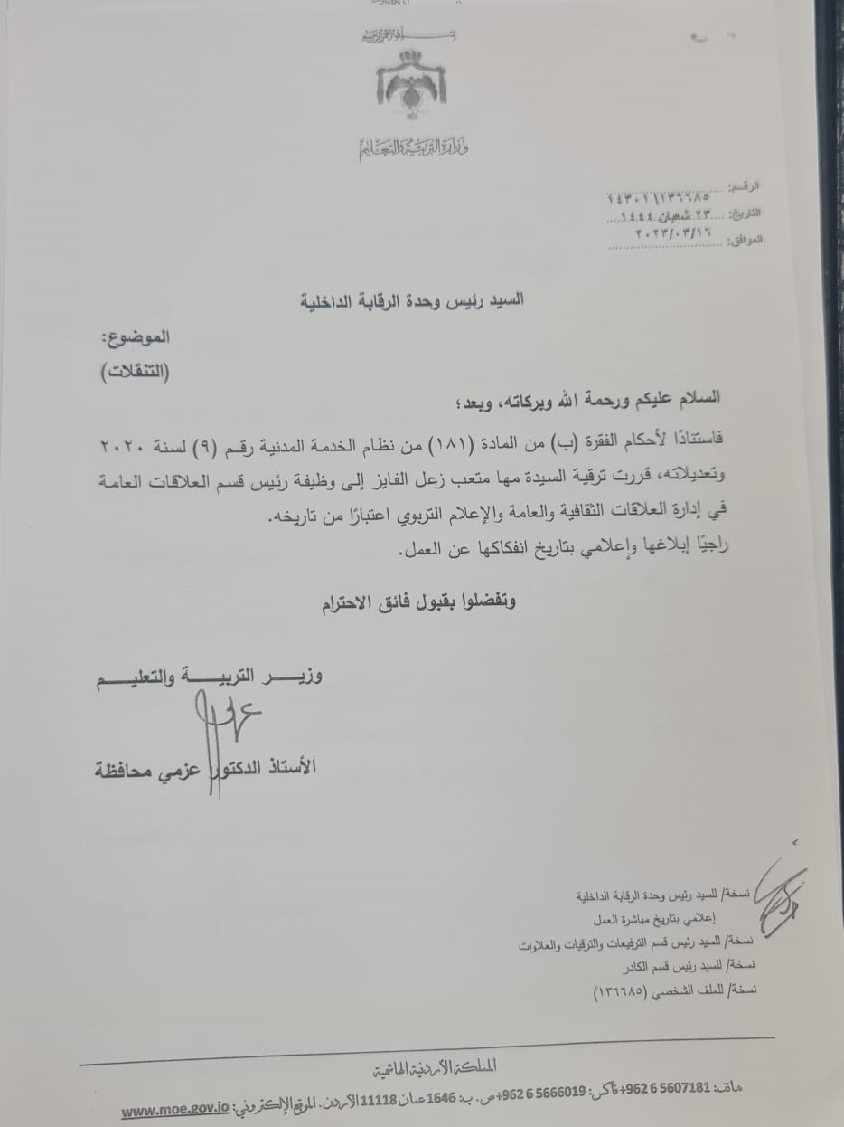 قرر وزير التربية والتعليم الدكتور عزمي محافظة، اجراء تشكيلات إدارية في مديريات الوزارة.