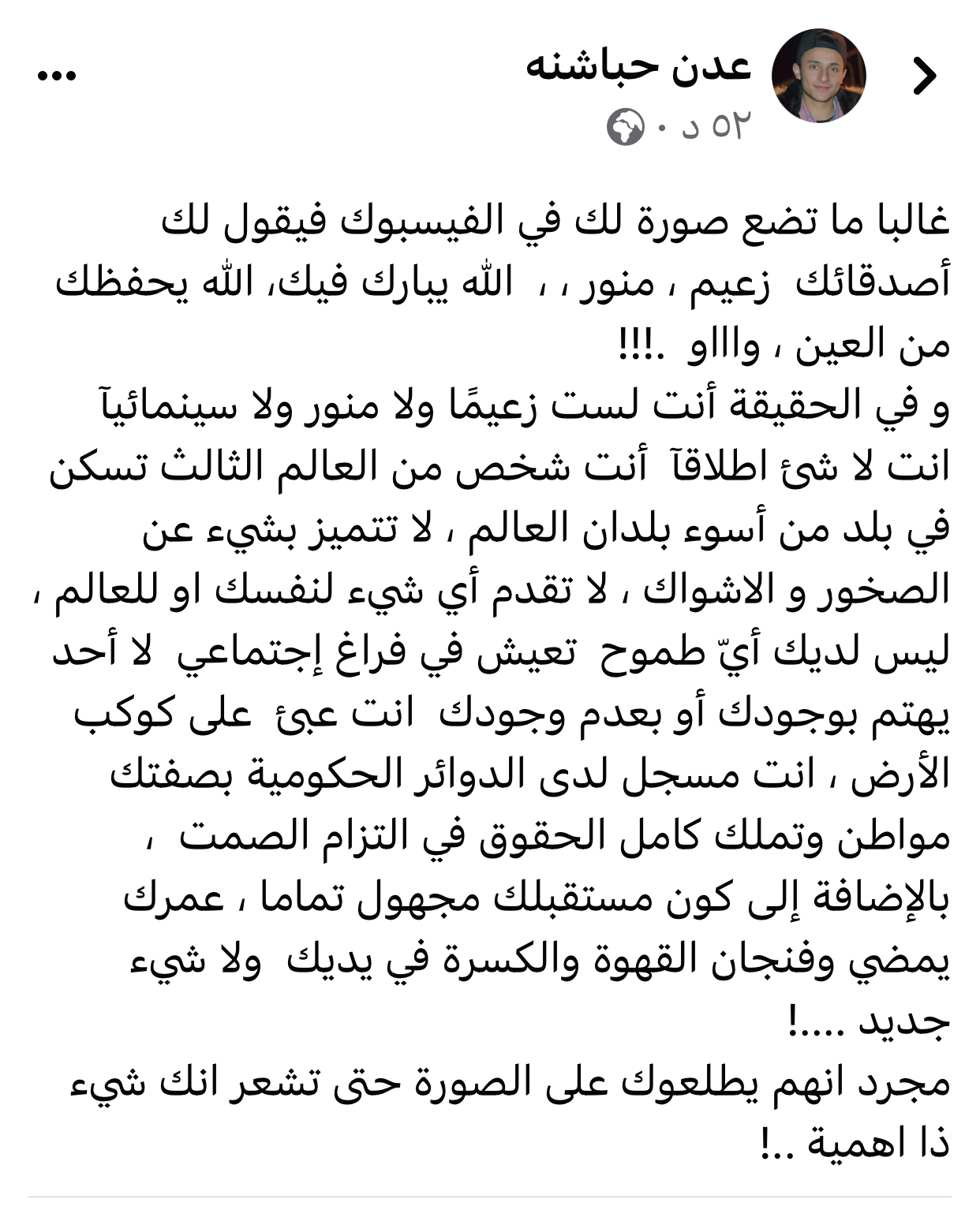 عدن الحباشنة : عندما يعلق لك اصدقاءك عبر السوشيال ميديا على صورك بانك منور او زعيم فلا تنخدع بذلك ! … لأنك لا شئ !