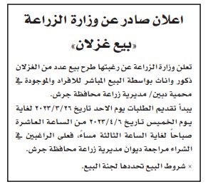 أعلنت وزارة الزراعة اليوم الأحد، عن رغبتها في طرح بيع عدد من الغزلان (ذكور وإناث) بواسطة البيع المباشر للأفراد، والموجودة في محمية دبين/ مديرية زراعة محافظة جرش.