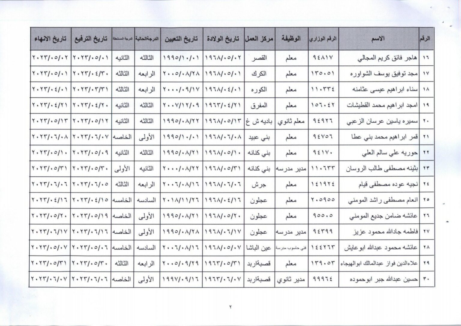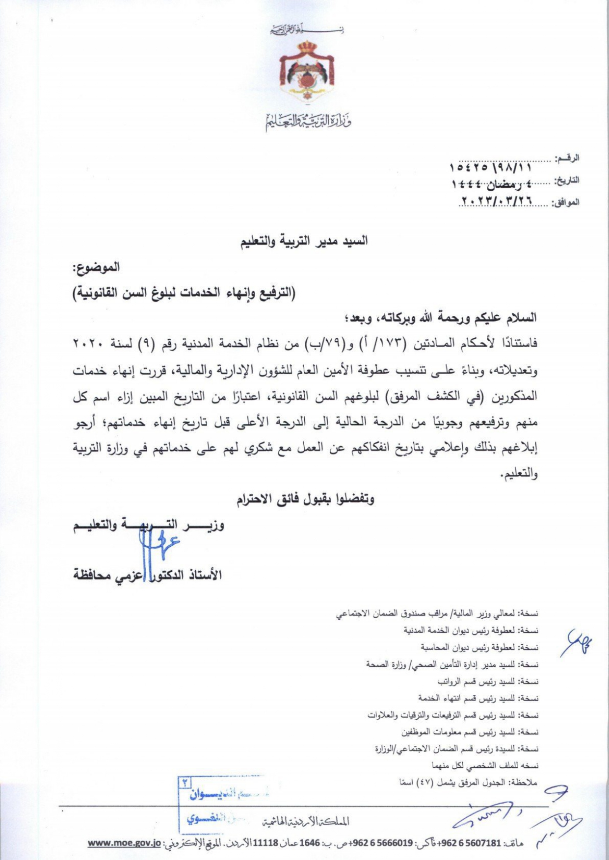 وجرى ترفيع المحالين إلى التقاعد وجوبيا من الدرجة الحالية إلى الدرجة الأعلى قبل تاريخ إنهاء خدماتهم.