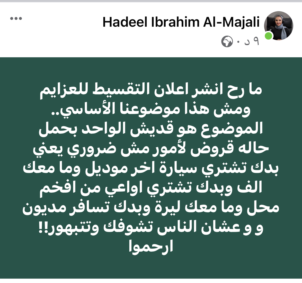 وقالت المهندسة هديل المجالي عبر الفيسبوك :- ما رح انشر اعلان التقسيط للعزايم ومش هذا موضوعنا الأساسي.. الموضوع هو قديش الواحد بحمل حاله قروض لأمور مش ضروري يعني بدك تشتري سيارة اخر موديل وما معك الف وبدك تشتري اواعي من افخم محل وما معك ليرة وبدك تسافر مديون و و عشان الناس تشوفك وتتبهور!! ارحموا