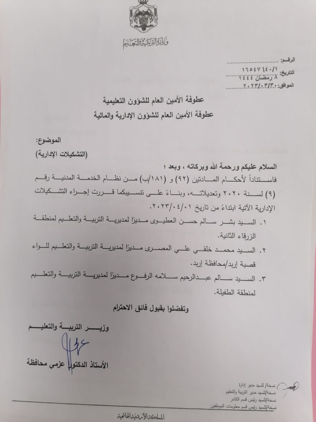 قرر وزير التربية والتعليم الدكتور عزمي المحافظة اجراء عدد من التشكيلات الإدارية والاحالات على التقاعد في وزارة التربية والتعليم.