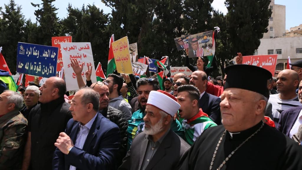 وأكدوا أن قضية القدس قضية عقدية والاقصى معركة أمة وكرامة والوصاية الهاشمية حق وسنبقى في الأردن شوكة في حلق إسرائيل ونقاوم خلف قيادة جلالة الملك عبدالله الثاني تجاه فلسطين والمقدسات.