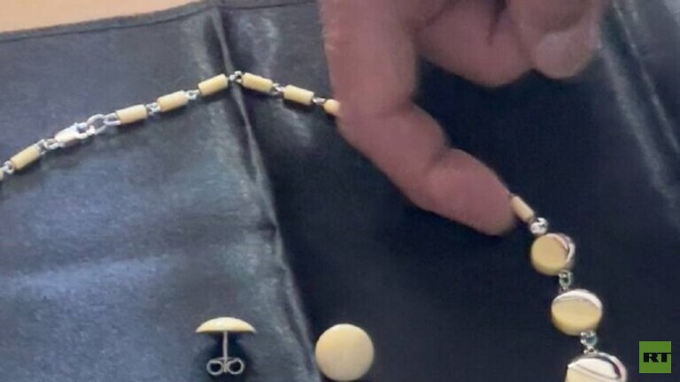 قطع المجوهرات مصنوعة من ناب حيوان الماموث والزمرد والذهب الأبيض، وتسلم الهدية قاضي قضاة فلسطين الدكتور محمود الهباش، بحضور وفد روسي على رأسه ممثل روسيا الاتحادية لدى السلطة الفلسطينية غوشا بوتشيندازه.