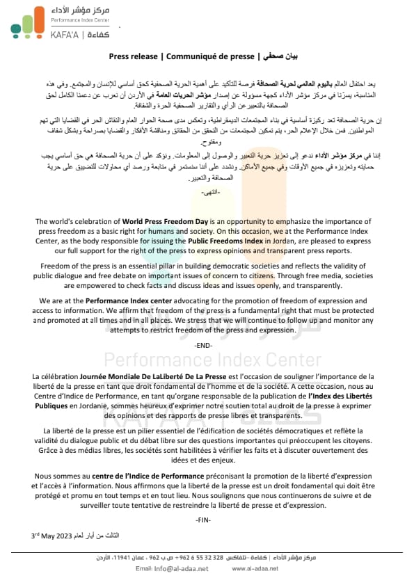 يعد احتفال العالم باليوم العالمي لحرية الصحافة فرصة للتأكيد على أهمية الحرية الصحفية كحق أساسي للإنسان والمجتمع. وفي هذه المناسبة، يسرّنا في مركز مؤشر الأداء كجهة مسؤولة عن إصدار مؤشر الحريات العامة في الأردن أن نعرب عن دعمنا الكامل لحق الصحافة بالتعبيرعن الرأي والتقارير الصحفية الحرة والشفافة.
