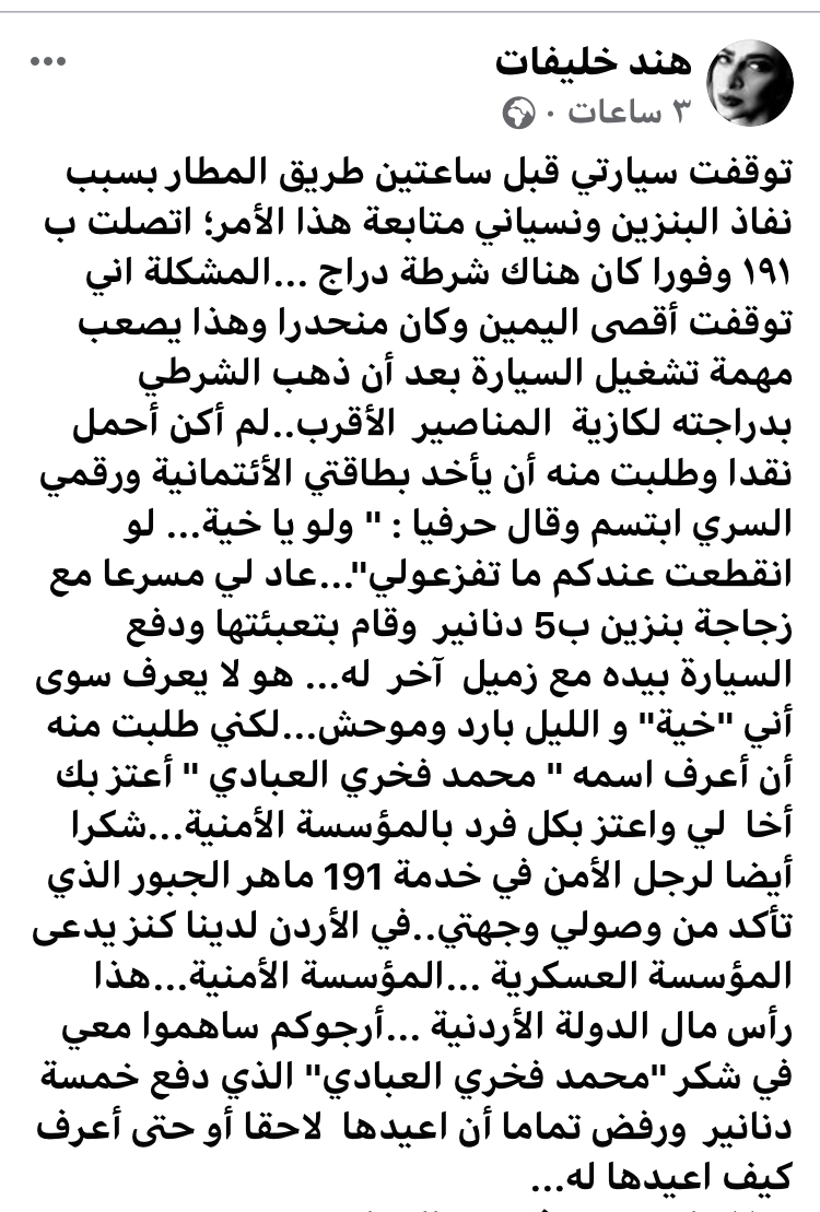 وفي تفاصيل القصة قالت المواطنة "هند خليفات" في منشور لها على فيسبوك: " توقفت سيارتي قبل ساعتين طريق المطار بسبب نفاذ البنزين ونسياني متابعة هذا الأمر؛ اتصلت ب ١٩١ وفورا كان هناك شرطة دراج ...المشكلة اني توقفت أقصى اليمين وكان منحدرا وهذا يصعب مهمة تشغيل السيارة بعد أن ذهب الشرطي بدراجته لكازية المناصير الأقرب..لم أكن أحمل نقدا وطلبت منه أن يأخد بطاقتي الأئتمانية ورقمي السري ابتسم وقال حرفيا : " ولو يا خية... لو انقطعت عندكم ما تفزعولي"...عاد لي مسرعا مع زجاجة بنزين ب5 دنانير وقام بتعبئتها ودفع السيارة بيده مع زميل آخر له... هو لا يعرف سوى أني "خية" و الليل بارد وموحش...لكني طلبت منه أن أعرف اسمه " محمد فخري العبادي " أعتز بك أخا لي واعتز بكل فرد بالمؤسسة الأمنية...شكرا أيضا لرجل الأمن في خدمة 191 ماهر الجبور الذي تأكد من وصولي وجهتي..في الأردن لدينا كنز يدعى المؤسسة العسكرية ...المؤسسة الأمنية...هذا رأس مال الدولة الأردنية ...أرجوكم ساهموا معي في شكر "محمد فخري العبادي" الذي دفع خمسة دنانير ورفض تماما أن اعيدها لاحقا أو حتى أعرف كيف اعيدها له".