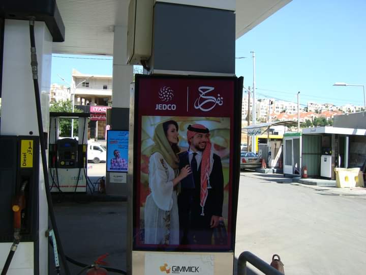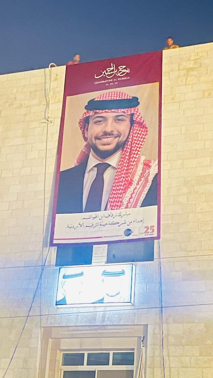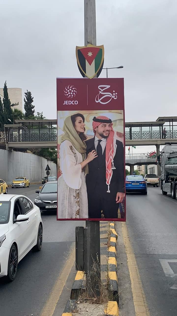 المؤسسة الأردنية لتطوير المشاريع الاقتصادية والشركات التابعة والشركاء من القطاع الخاص يزينون عدة مناطق بصور سمو الأمير الحسين ولي العهد وعروسته احتفالاً بزفافه الميمون.