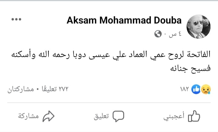 ونعى العماد دوبا، ابن شقيقه، في منشور عبر صفحته على فيسبوك.