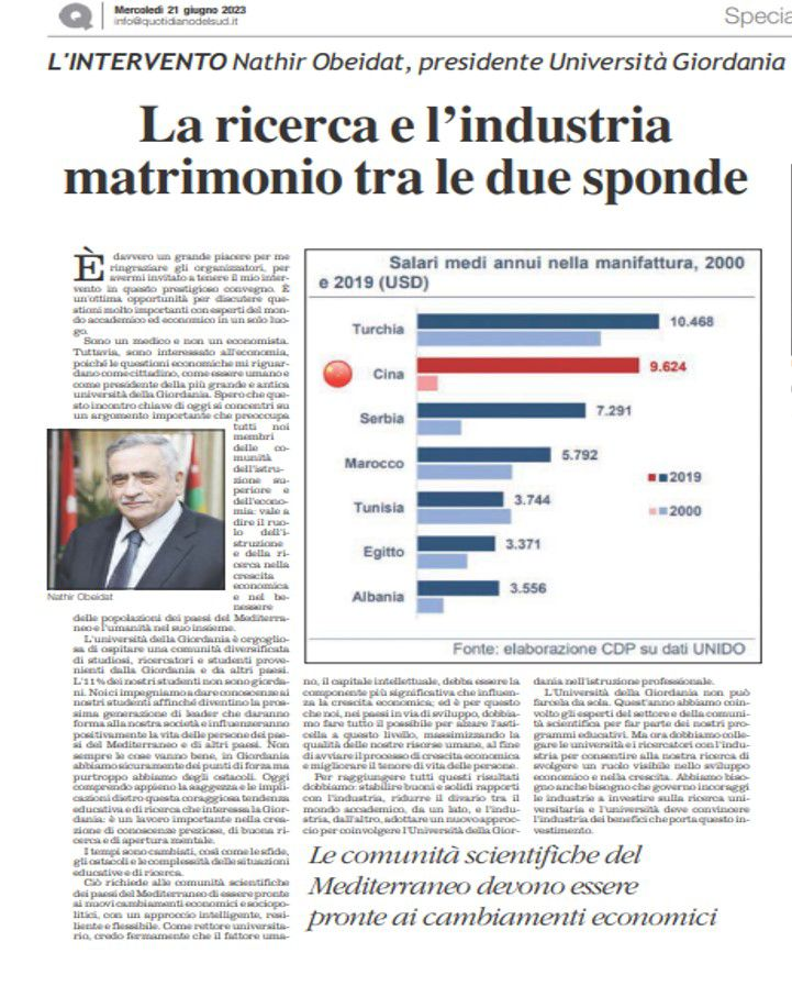 وفي سياق ذلك أطلق منظمو مهرجان الاقتصاد اليورو-متوسطي في إيطاليا حملة تحضير النسخة الثانية في ربيع ٢٠٢٤، ستحل فيه الجامعة الاردنية مرجعا رئيسيا لمنطقة الشرق الاوسط.