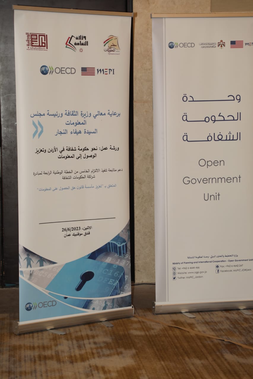 افتتحت وزيرة الثقافة ورئيسة مجلس المعلومات هيفاء النجار اليوم الاثنين (26 /6 ) ورشة عمل (نحو حكومة شفافة في الأردن وتعزيز الحصول على المعلومة)، لدعم ومتابعة تنفيذ الالتزام الخامس من الخطة الوطنية الرابعة لمبادرة شراكة الحكومات الشفافة المتعلق بـ "تعزيز مأسسة قانون حق الحصول على المعلومات" بفندق موفينبك عمان.