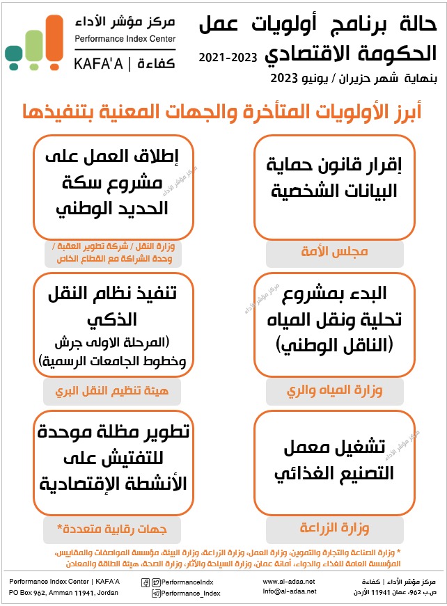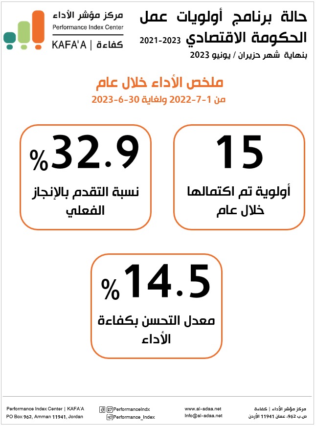 أصدر مركز مؤشر الأداء تقريره النصف سنوي والخاص بمتابعة أداء حالة برنامج أولويات عمل الحكومة الاقتصادي 2021-2023، والذي أظهر اكتمال 30 أولوية من أصل 58، وبمعدل كفاءة أداء مقداره 70.4%، حيث بلغت نسبة الانجاز الفعلي 57% مقارنة بـ 81% كنسبة إنجاز مخطط بنهاية شهر حزيران / يونيو 2023. وخلال عام ولنهاية شهر حزيران 2023، بين التقريرأن نسبة التقدم بالإنجاز الفعلي بلغت 32.9% وتحسن بمعدل كفاءة الأداء مقداره 14.5% نتيجة اكتمال 15 أولوية، مع ثبات تصنيف البرنامج عند المستوى الحرج حسب التصنيف الخاص بالمركز لأداء البرامج والمشاريع لعدم تقلص الفجوة ما بين الانجاز المخطط والفعلي.