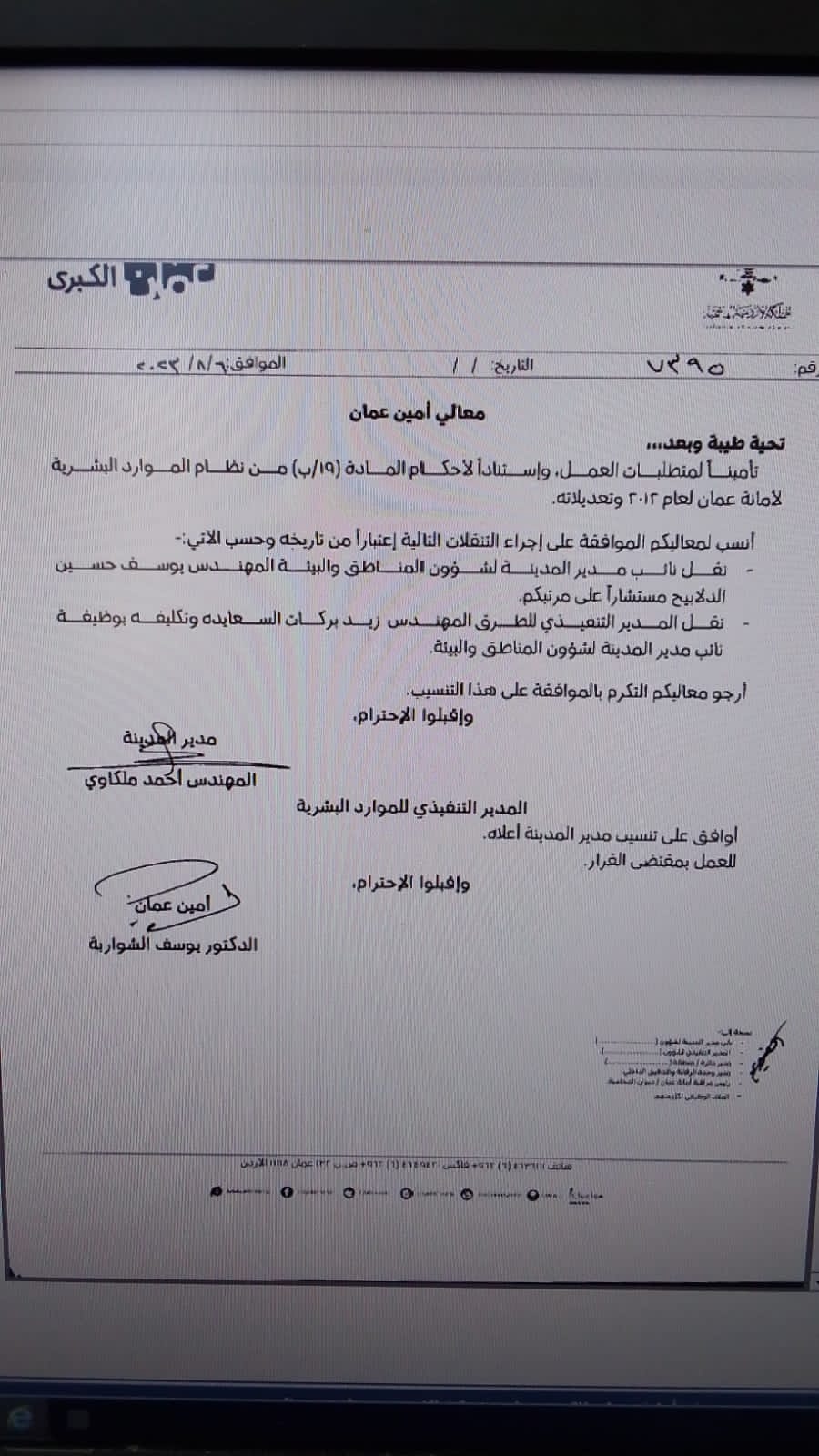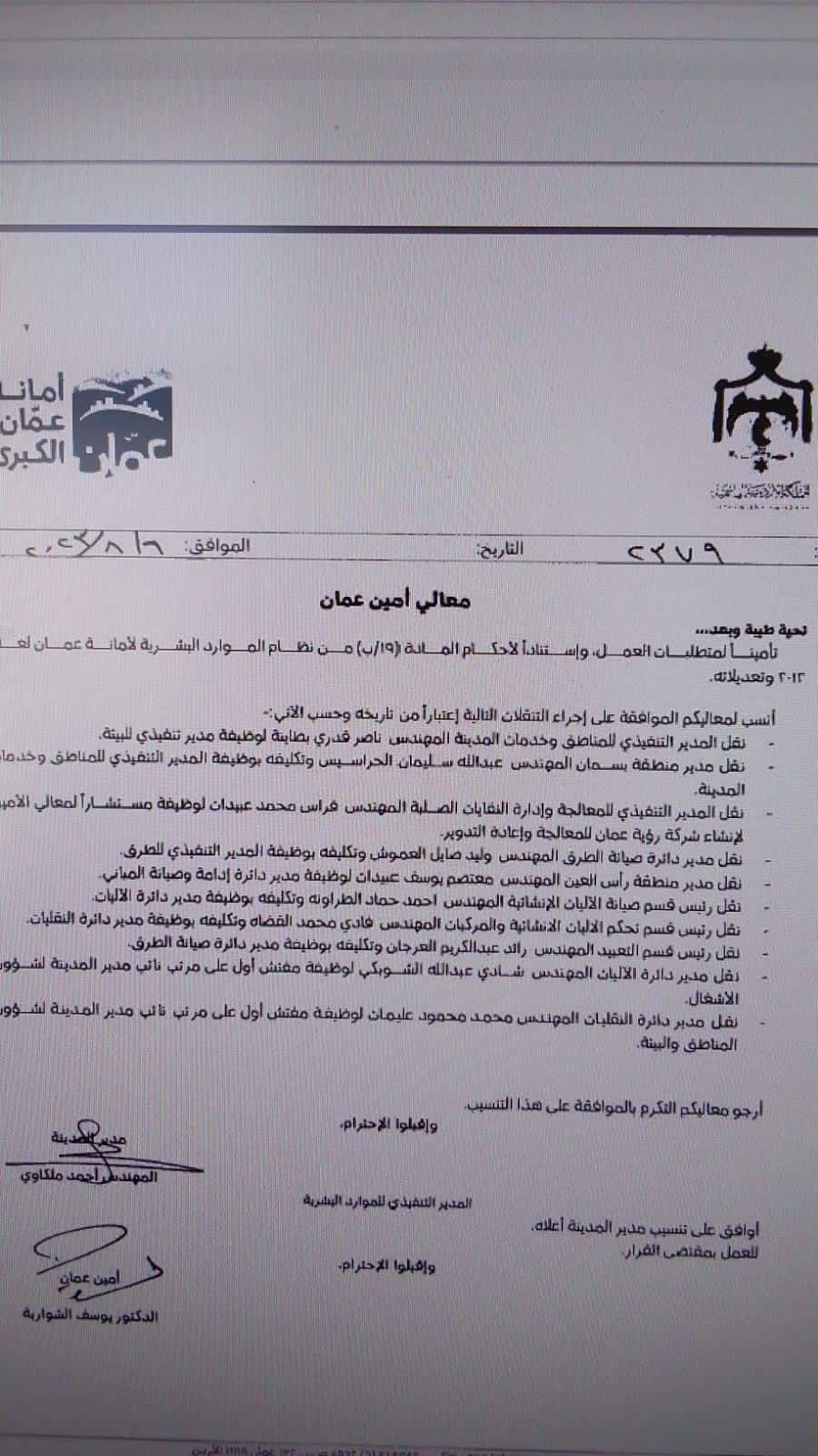أجرى أمين عمّان يوسف الشواربة عددا من التنقلات بين موظفي الأمانة.