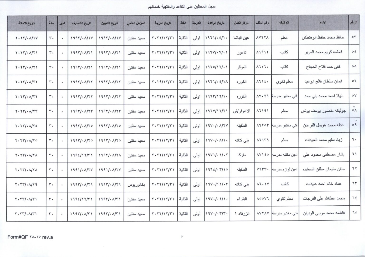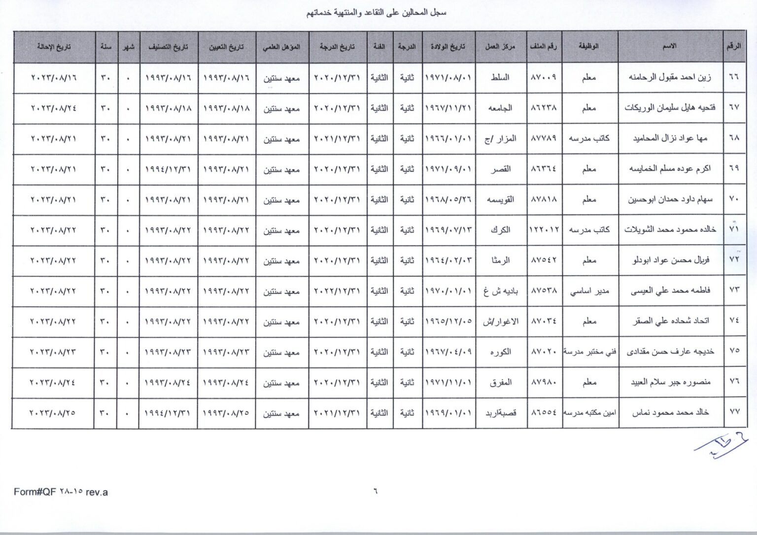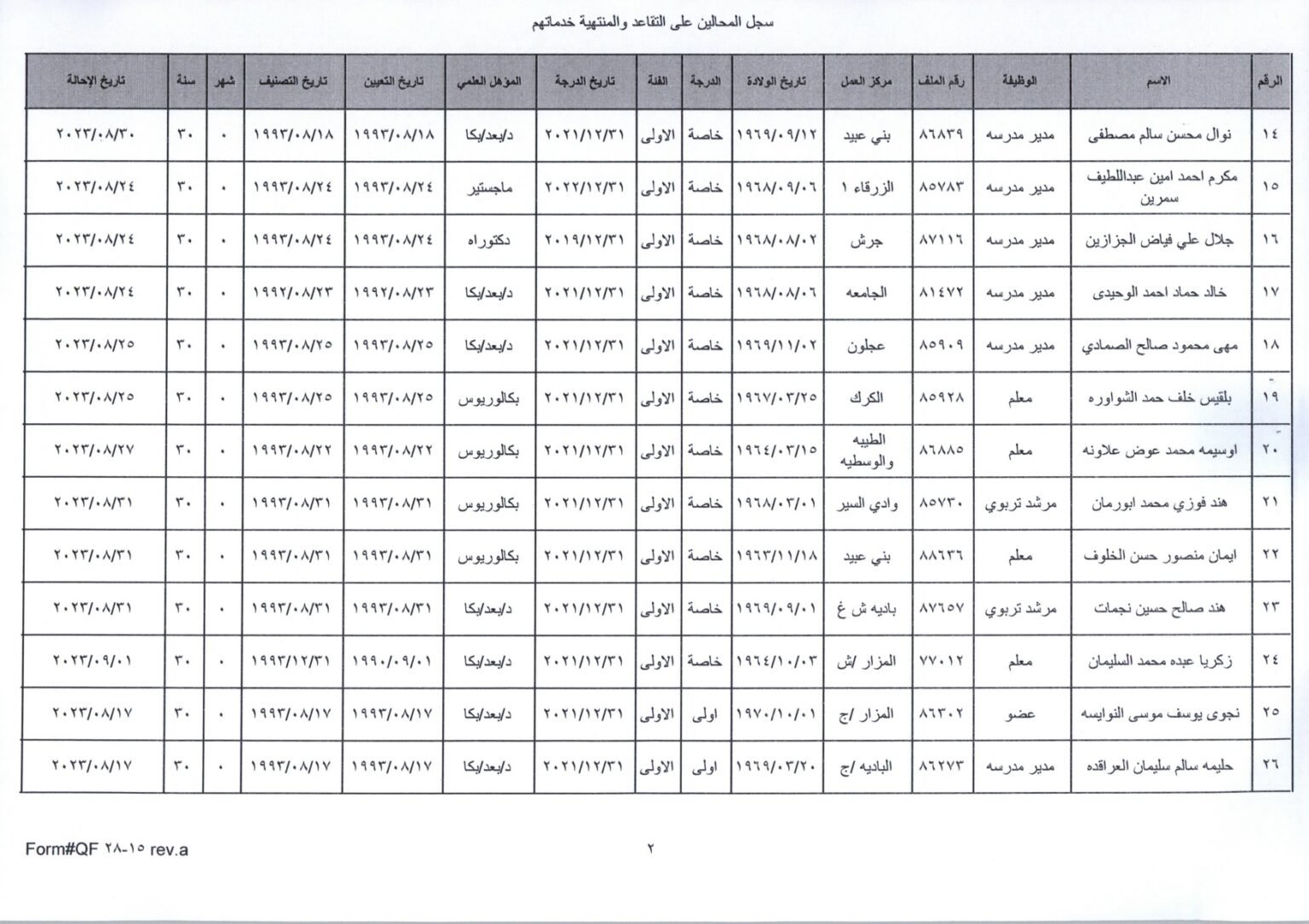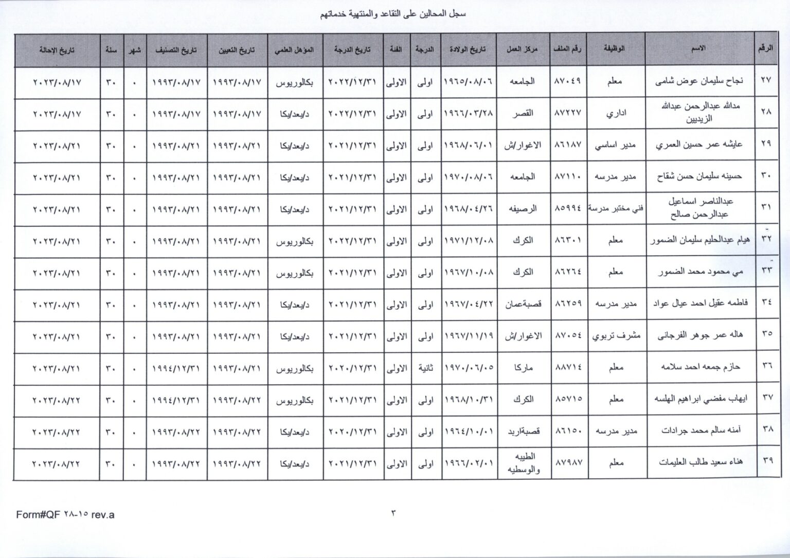 قرر مجلس الوزراء إحالة موظفين من ملاك وزارة التربية والتعليم على التقاعد ابتداء من صباح التاريخ المبين إزاء اسم كل منهم وفق الجدول المرفق.