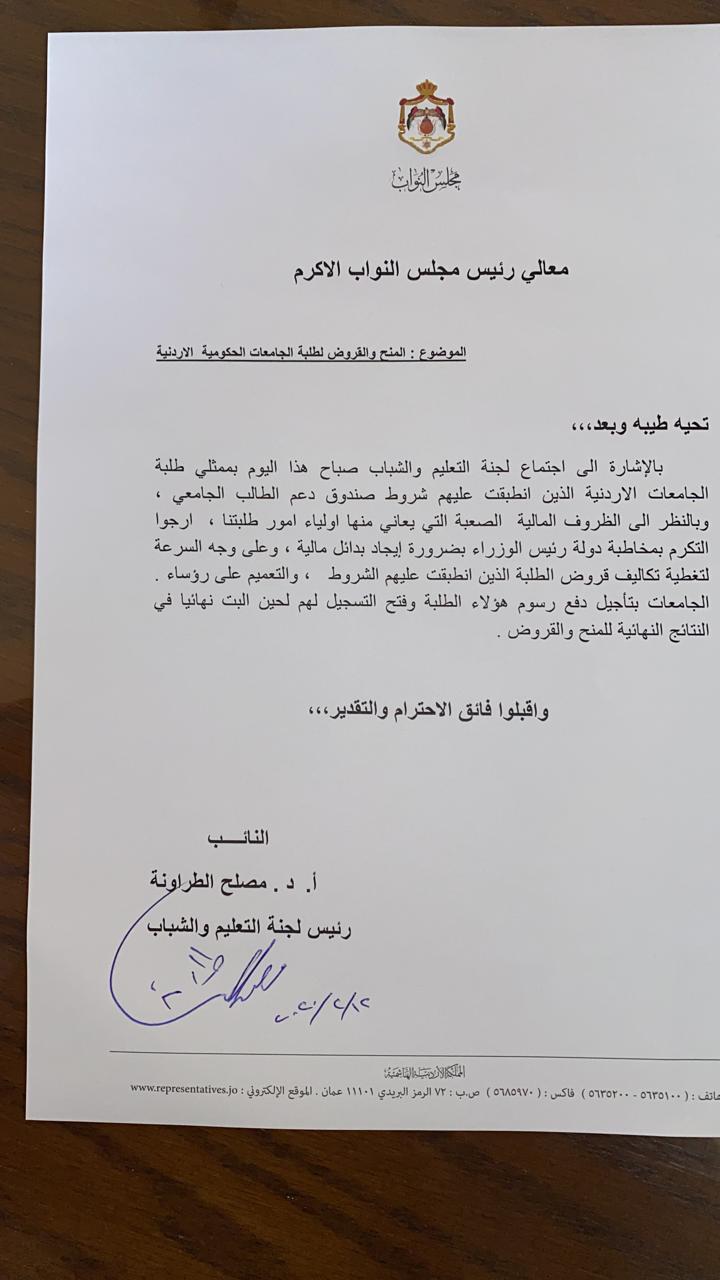 طالب النائب الدكتور مصلح الطراونة ر ئيس لجنة التعليم والشباب بمجلس النواب الحكومة بتوفير بدائل لدعم طلبة الجامعات ممن يعانوا من ظروف مادية صعبة وانطبقت عليهم شروط الحصول على منح وقروض من صندوق دعم الطالب ومخاطبة رؤساء الجامعات لتأجيل دفع رسومهم المستحقة وفتح التسجيل لهم لحين البت النهائي بملف المنح والقروض .