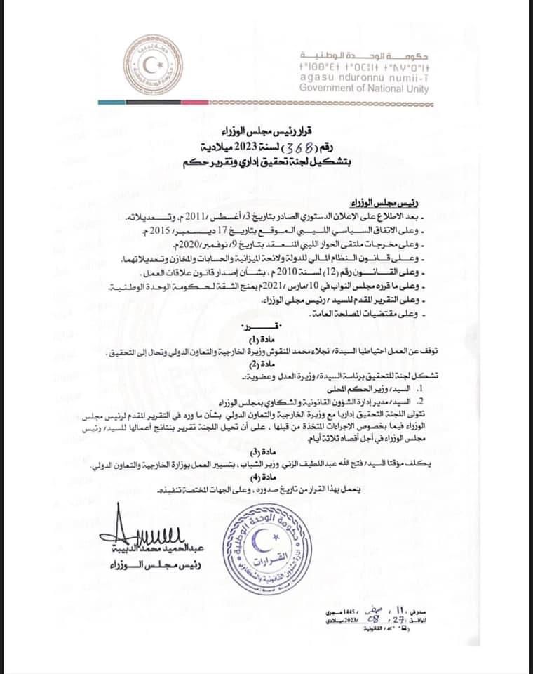 وجاء القرار رقم 368 لسنة 2023 على خلفية لقاء المنقوش في روما قبل أسبوع مع وزير الخارجية الإسرائيلي إيلي كوهين.