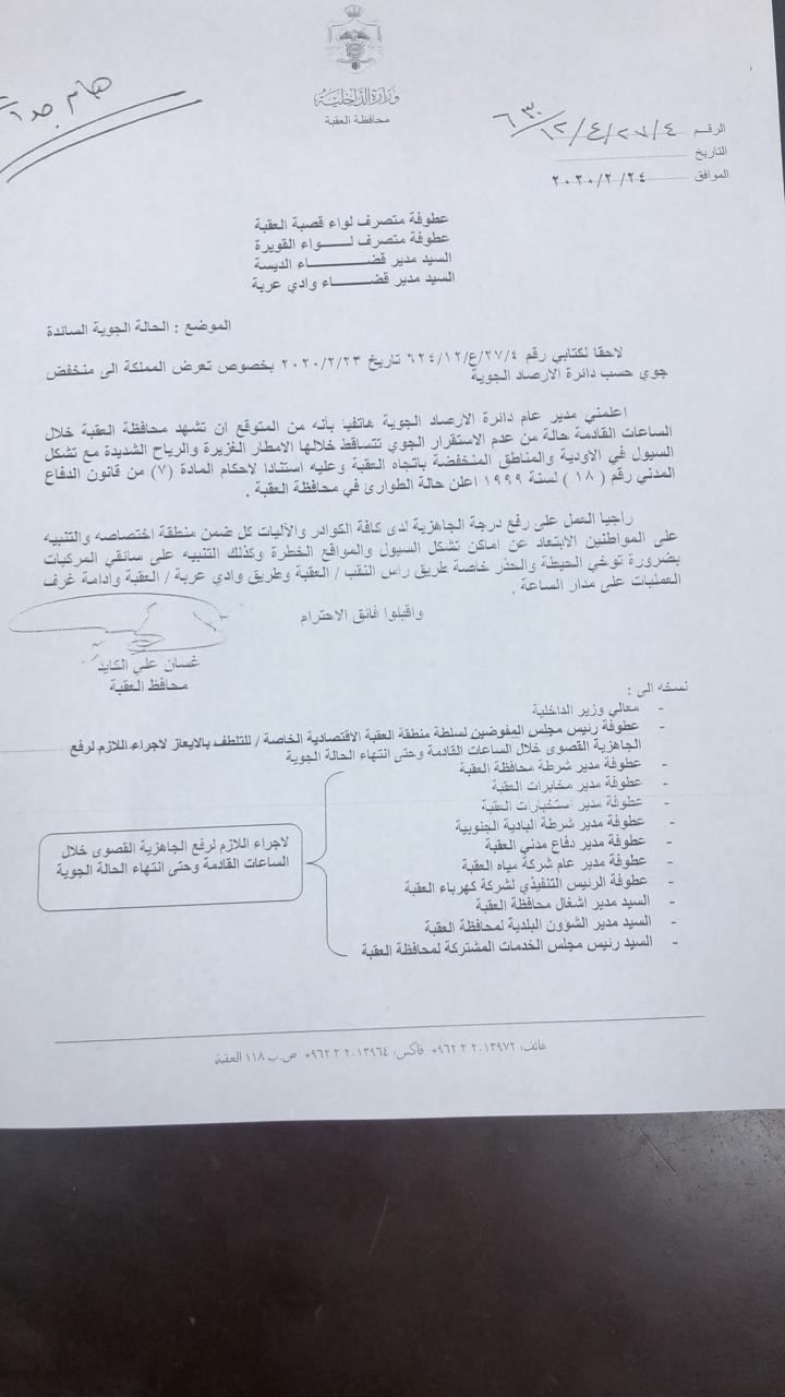 محافظة العقبة غسان الكايد يرفع حالة الطوارئ إلى القصوى في جميع ارجاء المحافظة نظرا لعدم استقرار الحالة الجوية.