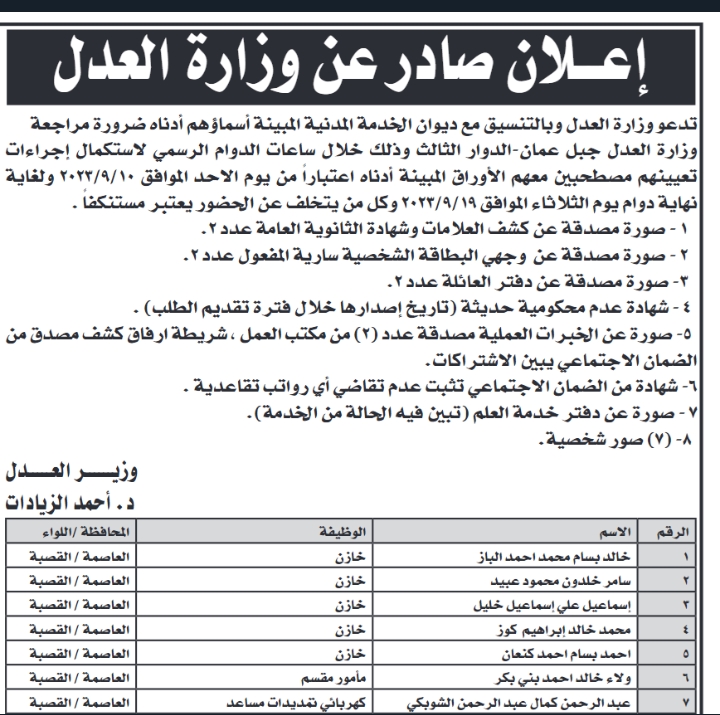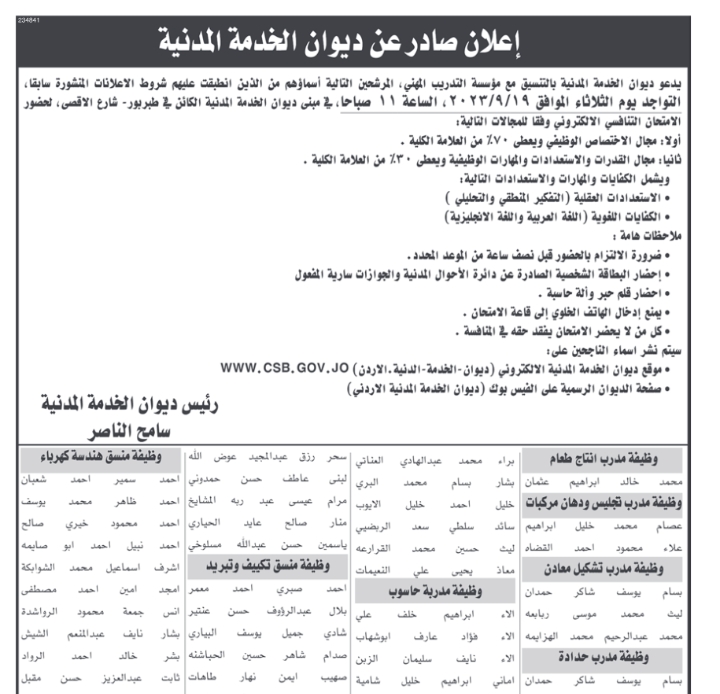 دعا ديوان الخدمة المدنية بالتنسيق مع عدد من الوزارات والمؤسسات الحكومية الأشخاص التالية لإجراء الاختبار التنافسي واستكمال إجراءات التعيين.كما أعلن عن وظائف شاغرة بالتنسيق مع الوزارات والمؤسسات الحكومية .