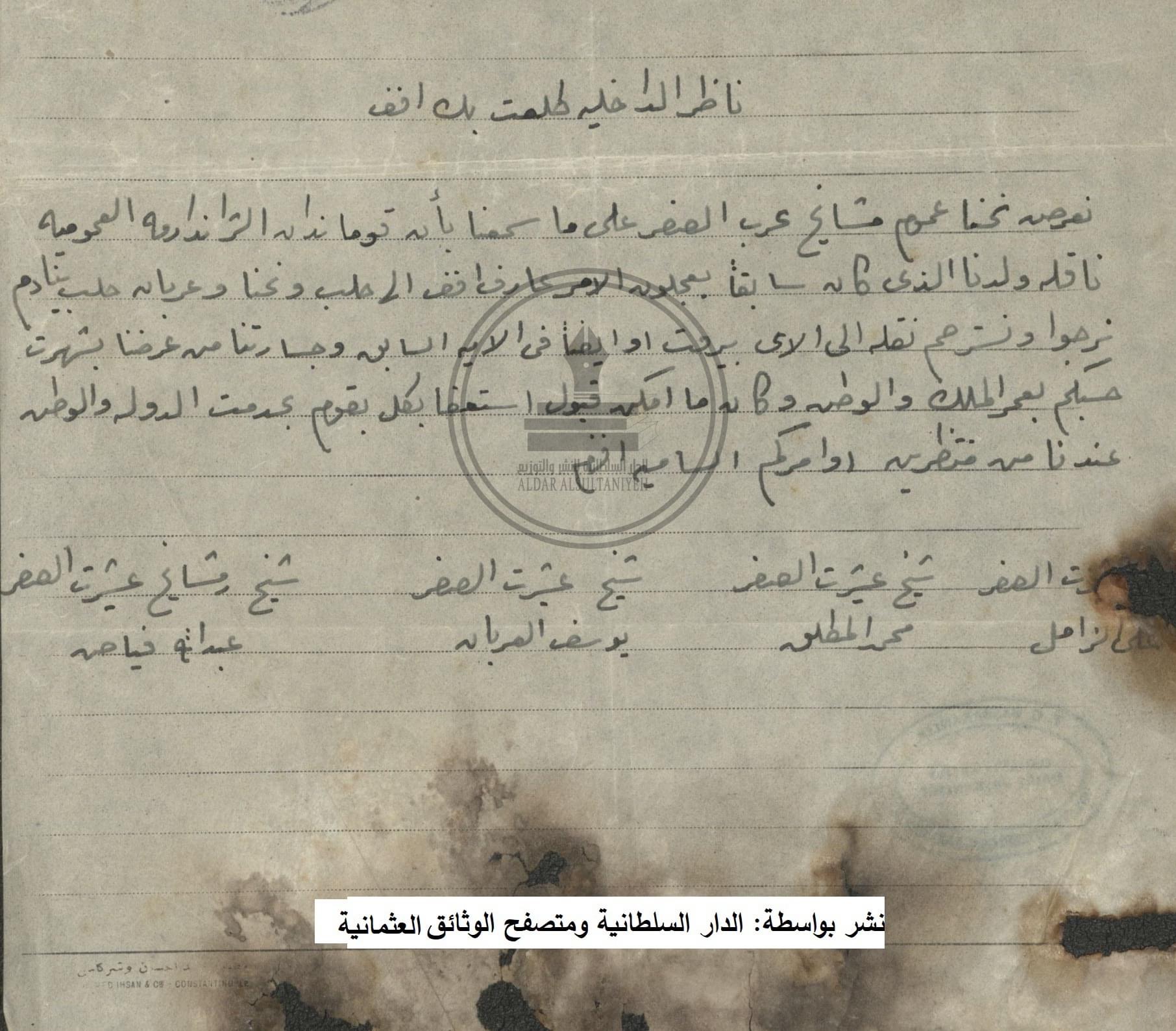من الذاكرة : كتاب من شيوخ عشيرة الصقر بعجلون إلى وزير الداخلية في الأستانة طلعت بك . عام 1905م ( وثيقة )