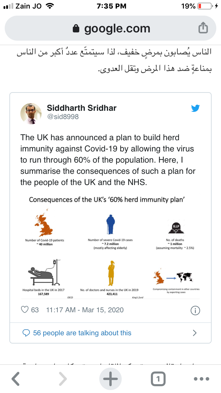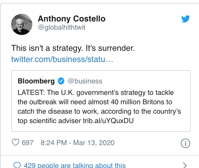 ويبدو أن الحكومة البريطانية تتبع سياسة “مناعة القطيع Herd Immunity” بالفعل في مواجهة فيروس كورونا، إذ لم تتخذ الكثير من الإجراءات الوقائية التي أُتخذت في الكثير من دول العالم، رغم تسجيل 1,140 إصابة حتى مساء الأحد 15 مارس/آذار 2020 و21 حالة وفاة.