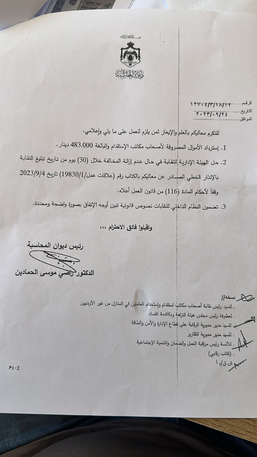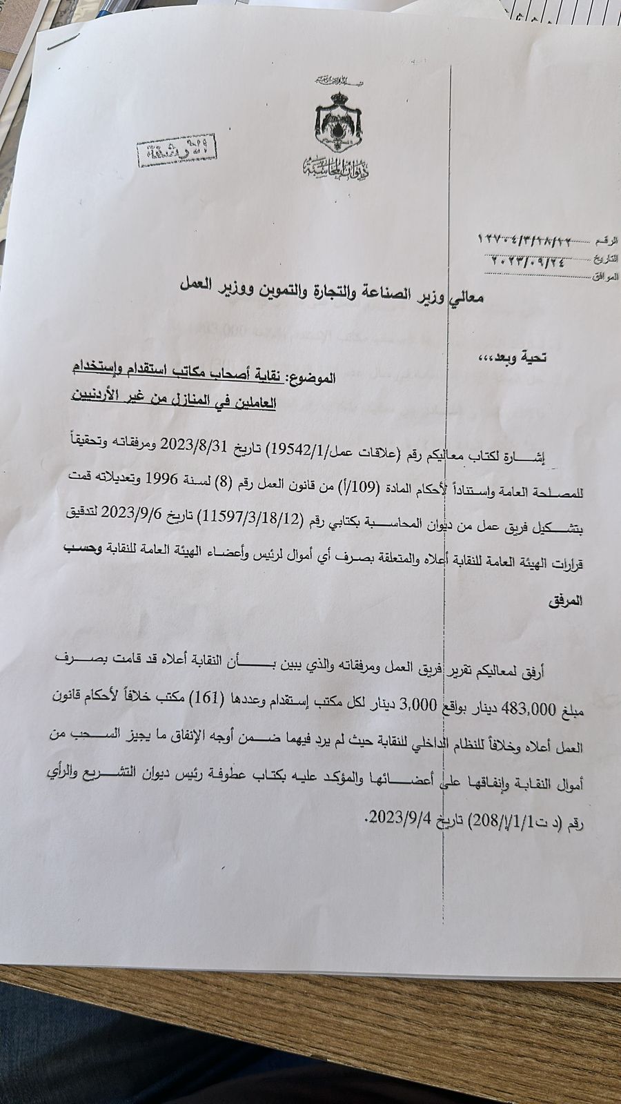 قضية نقابة أصحاب مكاتب استقدام واستخدام العاملين والعاملات في المنازل مع بدء العد التنازلي لقرار حل النقابة يوم الثلاثاء القادم في حال لم يتم إعادة مبلغ نصف مليون دينار قامت الهيئة الإدارية بصرفها للمكاتب قبل الانتخابات بيومين ويحاول أعضاء في الهيئة الإدارية الالتفاف على قرار وزارة العمل من خلال عدة طرق وإجراءات لمنع الوزارة من تنفيذ القرار او من خلال اللجوء للقضاء او الحصول على موافقه الوزيرة بتقسيط المبالغ التي صرفت مع علمهم باستحاله استرداد المبالغ من الاغلبيه من اعضاء الهيئه العامه لكنها محاولات لمنع حل النقابة لكسب الوقت مصادر في وزارة العمل أكدت ان ملف هذه النقابة شائك جدا ورغم تحذيرات الوزارة لادارتها بعدم التصرف باموالها الا انها لم تلتزم مما استدعى اتخاذ إجراءات سريعة لمنعها من التصرف بهذا الشكل بهذه الأموال مؤكدة اي المصادر ان المهلة لاعادة المبالغ هي في الرابع من الشهر الحالي والا سيتم اتخاذ الإجراءات المعلن عنها في قرار الوزارة وكتاب ديوان المحاسبةوكتاب هيئه النزاهه ومكافحه الفساد.