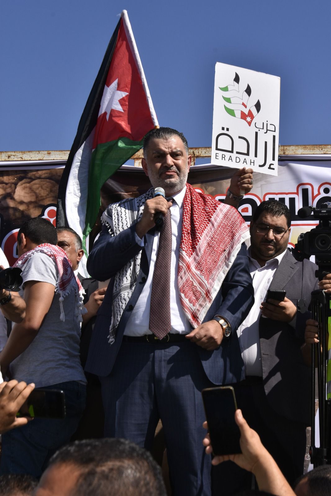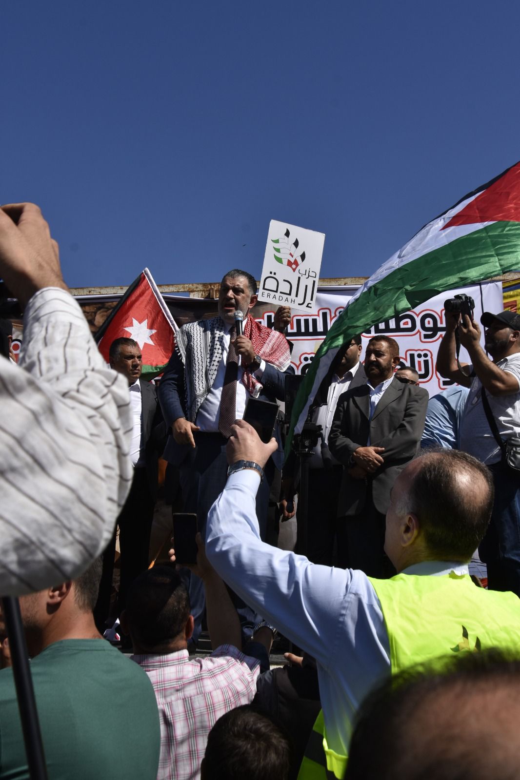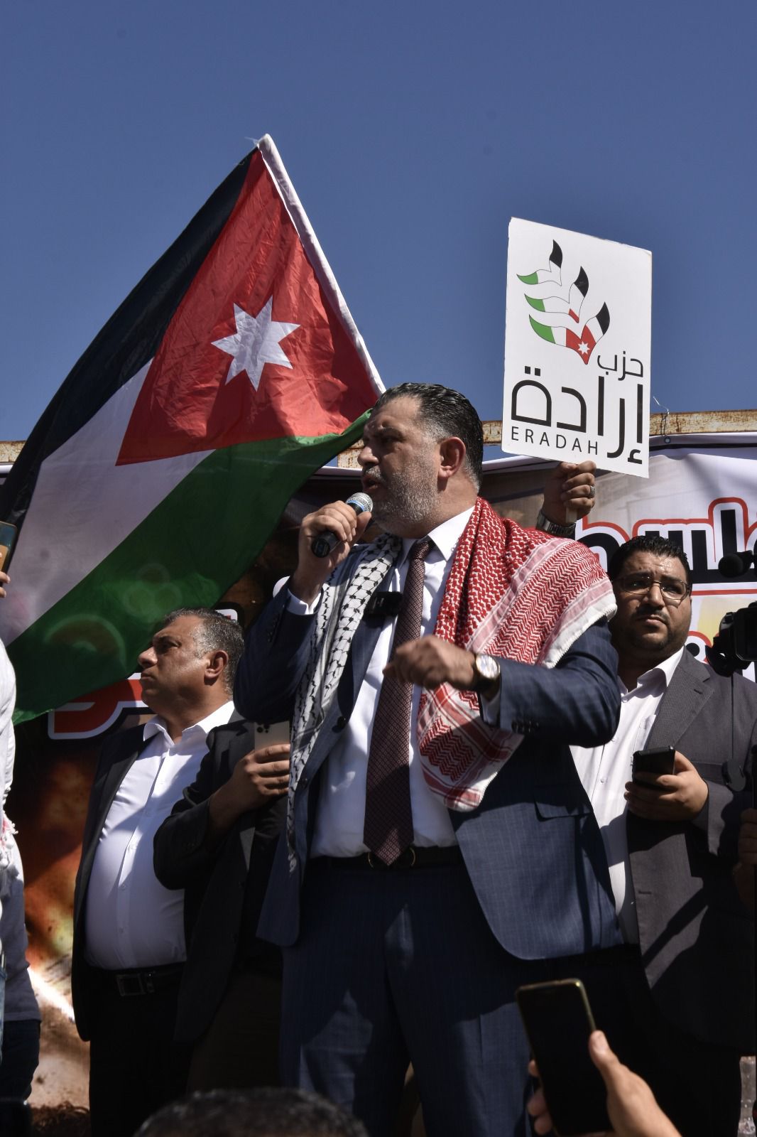 وقدم عضو المجلس المركزي في حزب إرادة الأمين العام لحزب إرادة نضال البطاينة، حيث قال البطاينة أن شعبنا الاردني الواحد في ارض الرباط ارض العزة والكرامة يعلنونها مدوية لا تنازل ولا تراجع عن الحقوق ولا تهاون مع عدو غاشم محتل، فكلنا فلسطينيون اليوم لأننا كلنا في الأردن أردنيون عندما يتعلق الشأن في الأردن وفلسطينيون عندما يتعلق الشأن بفلسطين واليوم البوصلة فلسطين.