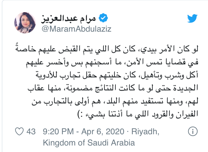 تسببت الممثلة السعودية مرام عبد العزيز بموجة واسعة من الجدل بعد أن تحدثت عن ضرورة تجربة علاج كورونا على المساجين بدل الفئران.