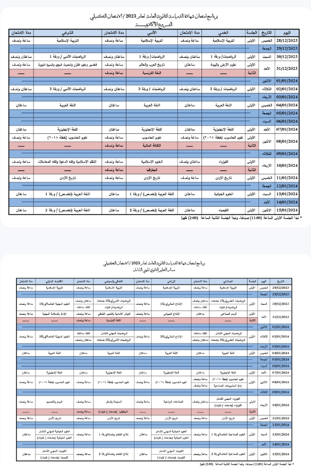 أعلنت وزارة التربية والتعليم اليوم جدول امتحان شهادة الدراسة الثانوية العامة لعام 2023 / الامتحان التكميلي، وسيكون أول أيام الامتحان الخميس الموافق 28 كانون أول 2023.وآخر أيام الامتحان الاثنين الموافق 15 كانون ثانٍ 2024، وستبدأ الجلسة الأولى في تمام الساعة الحادية عشرة صباحًا في حين ستبدأ الجلسة الثانية في تمام الساعة الثانية ظهرًا.