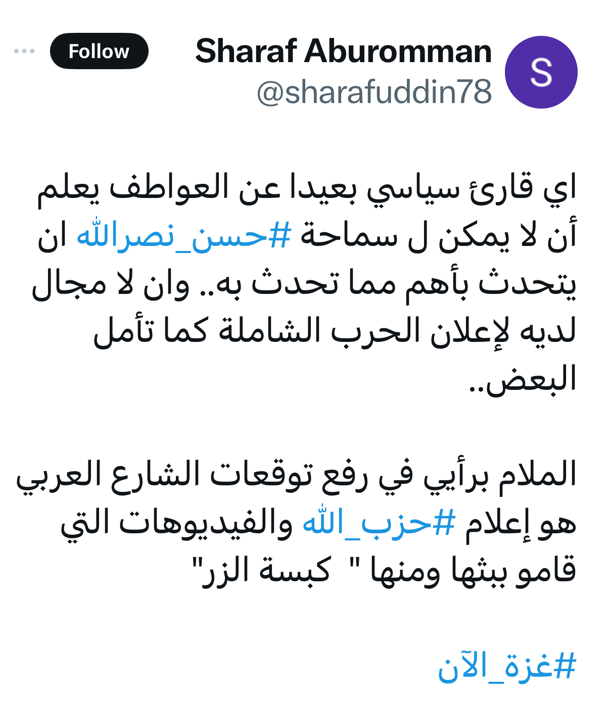 الملام برأيي في رفع توقعات الشارع العربي هو إعلام #حزب_الله والفيديوهات التي قامو ببثها ومنها " كبسة الزر"