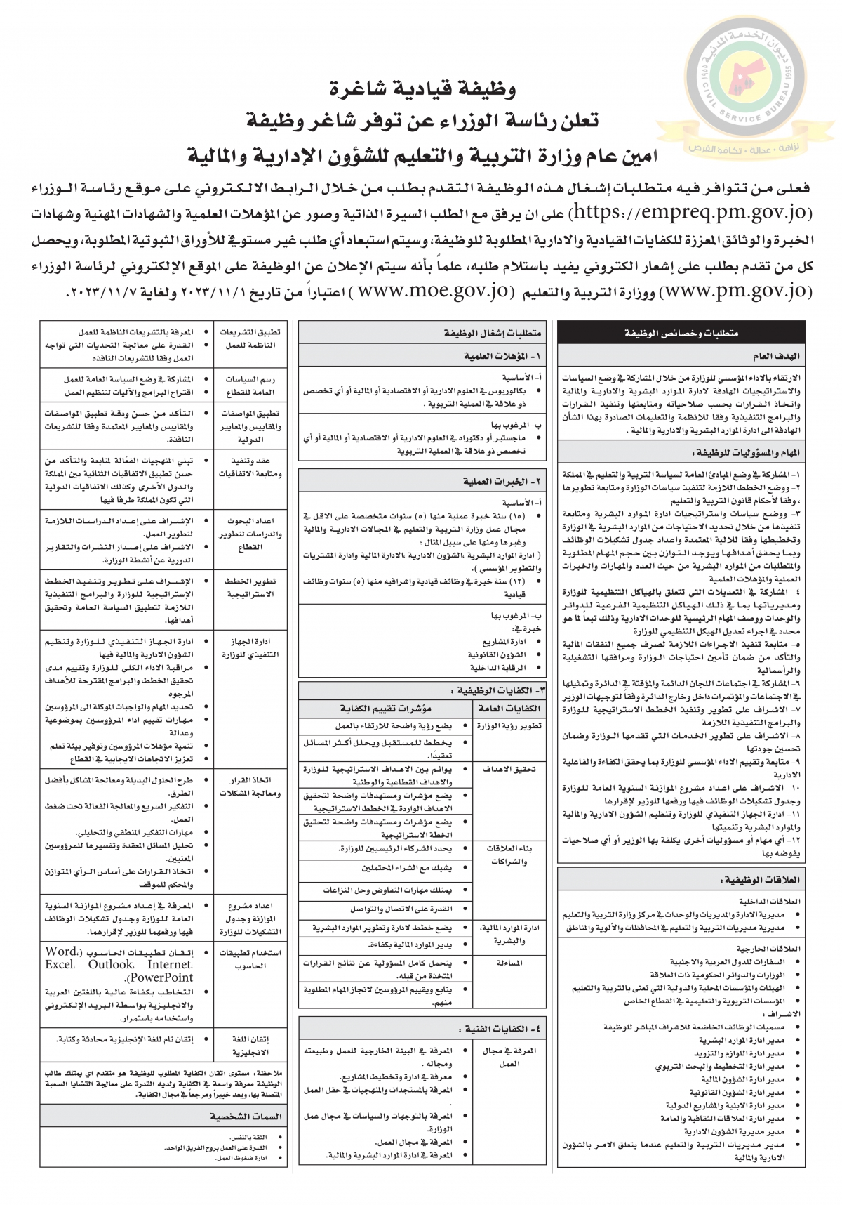 رئاسة الوزراء تعلن عن توفر شاغر وظيفة امينًا عامًا لوزارة التربية والتعليم للشؤون الإدارية والمالية